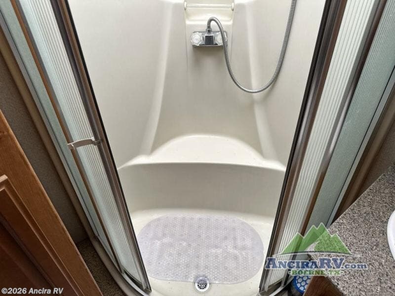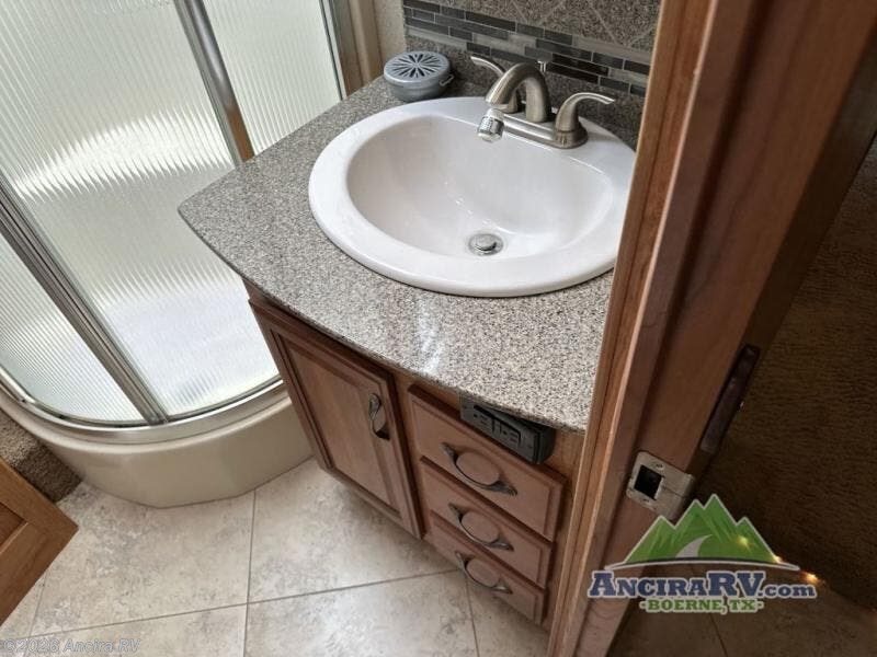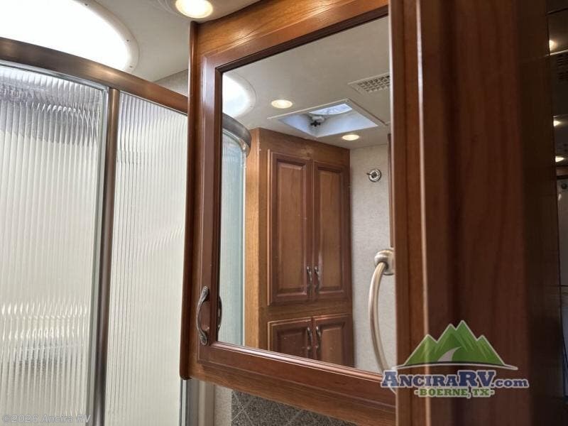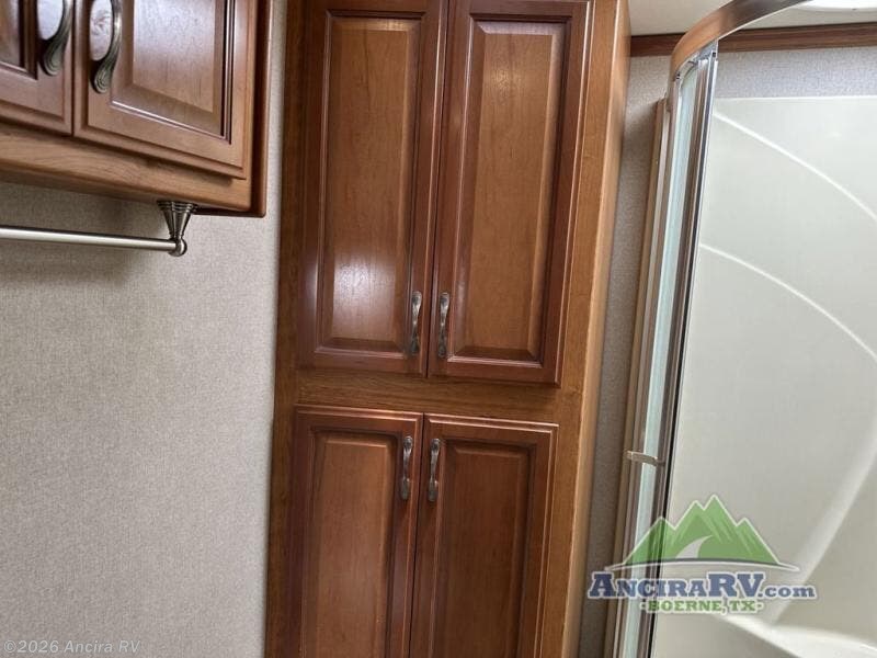Proceeding toward the rear of the motor home, you will come to a bathroom. Inside you will find a sink, linen cabinet, corner angle shower, and toilet.