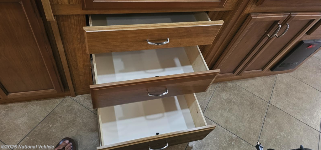 The fully equipped kitchen includes solid-surface countertops, a refrigerator, 3-burner range, oven, a combo convection/microwave, pantry, and plenty of cabinet storage. In the rear, the private master suite includes a walk-around queen bed, TV, overhead storage, and direct access to a full en-suite bathroom with a large shower, vanity, and linen closet. A convenient half bath is located mid-coach for guests.