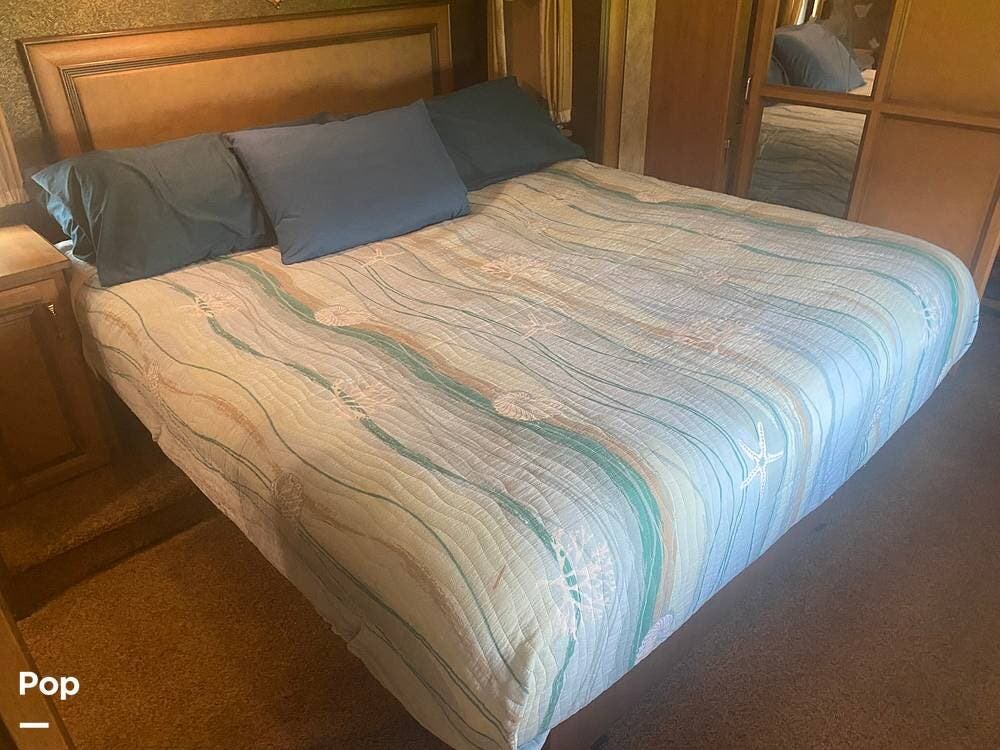 The main bedroom is carpeted, and the king-size bed is accessible from either side. There is plenty of closet space, and the layout affords ample privacy from the bathroom area.