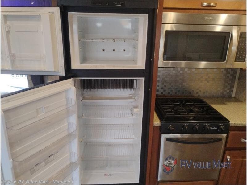 As you enter the fifth wheel, to the left is a slide with a dinette and sofa. The rear wall has an entertainment center. There is an additional slide with two lounge chairs, refrigerator, three burner range, and microwave. You will also find the double kitchen sink along one wall with counter space surrounding the sink.
