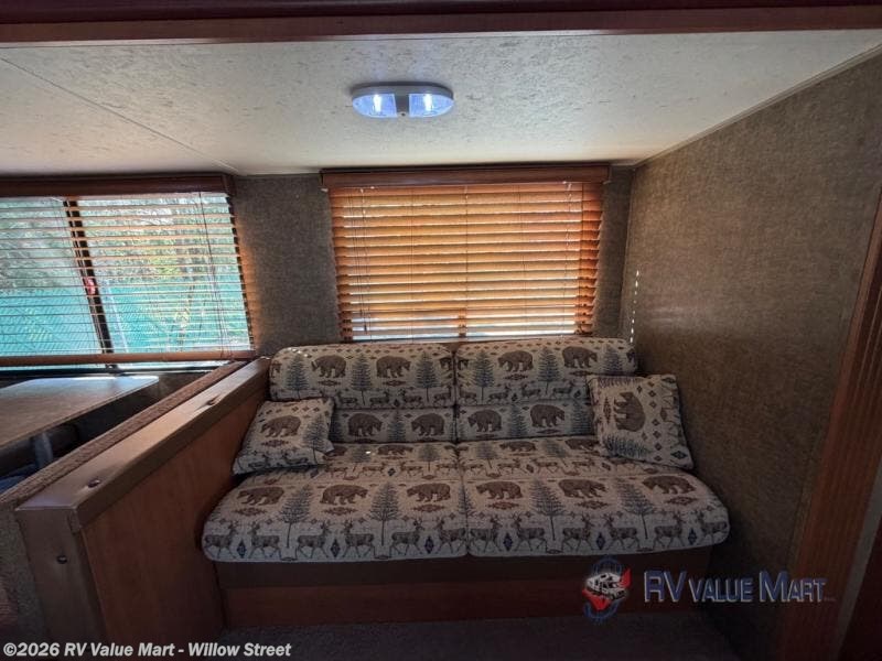 In the living area, there are two standard chairs just to the left of the entry door. An entertainment center and more linen storage are on the front wall of the living space. The side opposite the entry door includes a slide out. It has a sofa and a booth dinette with an optional skylight over the dinette.