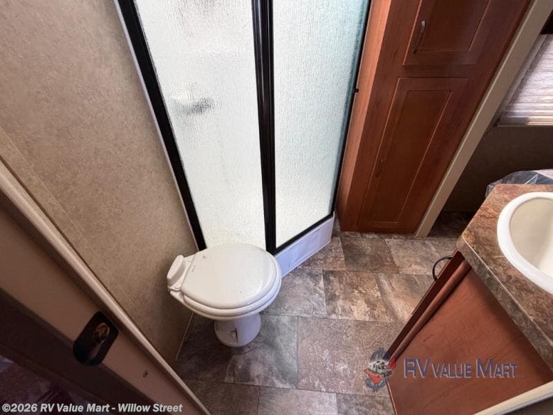 As you enter the travel trailer, a side aisle bathroom includes a toilet, corner shower, linen storage, and a corner vanity sink. It also includes a pocket door for entry to the bedroom.