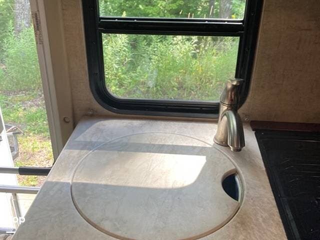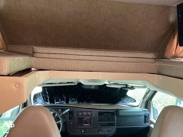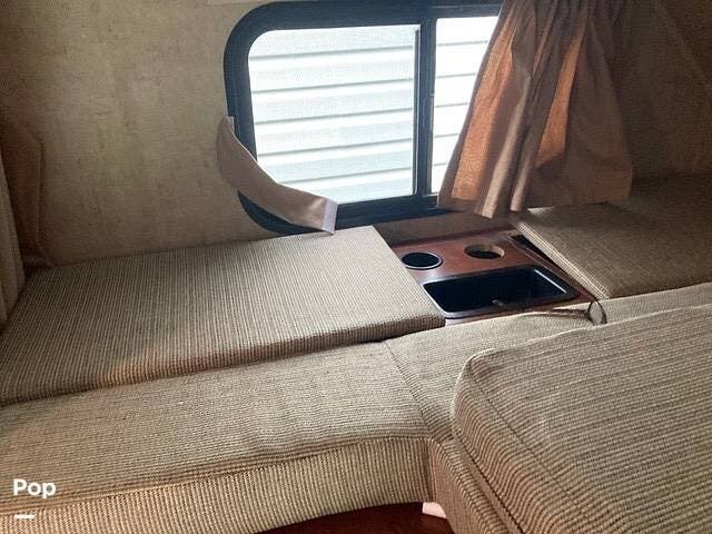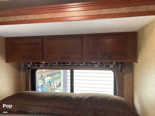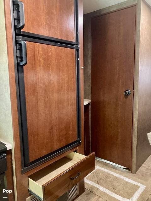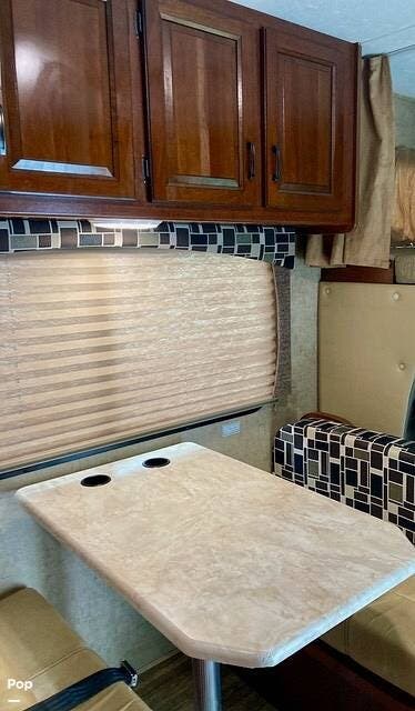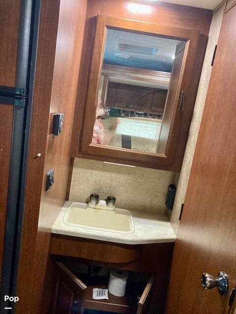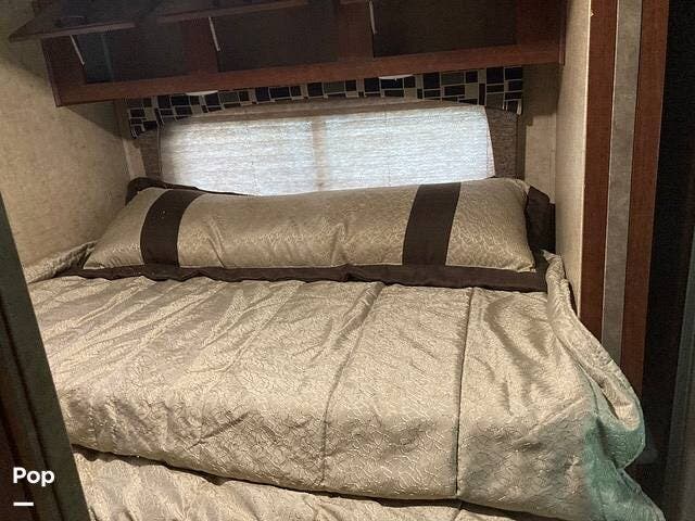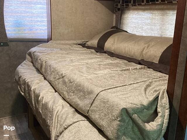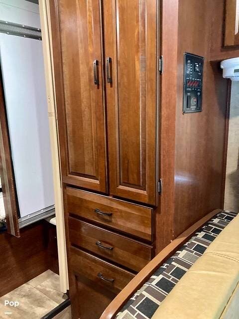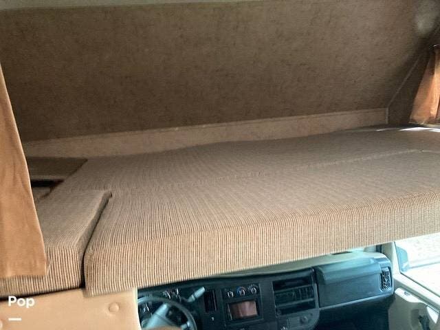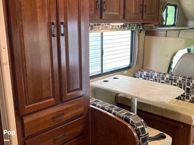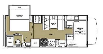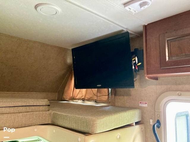 It has a single slide, a dinette and pantry, a large wardrobe, and a full bathroom! The bed above the cab is 60" by 80" and has a 42" TV.