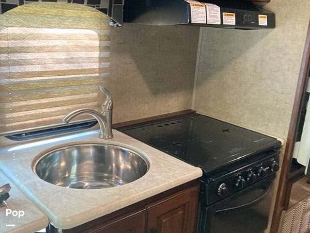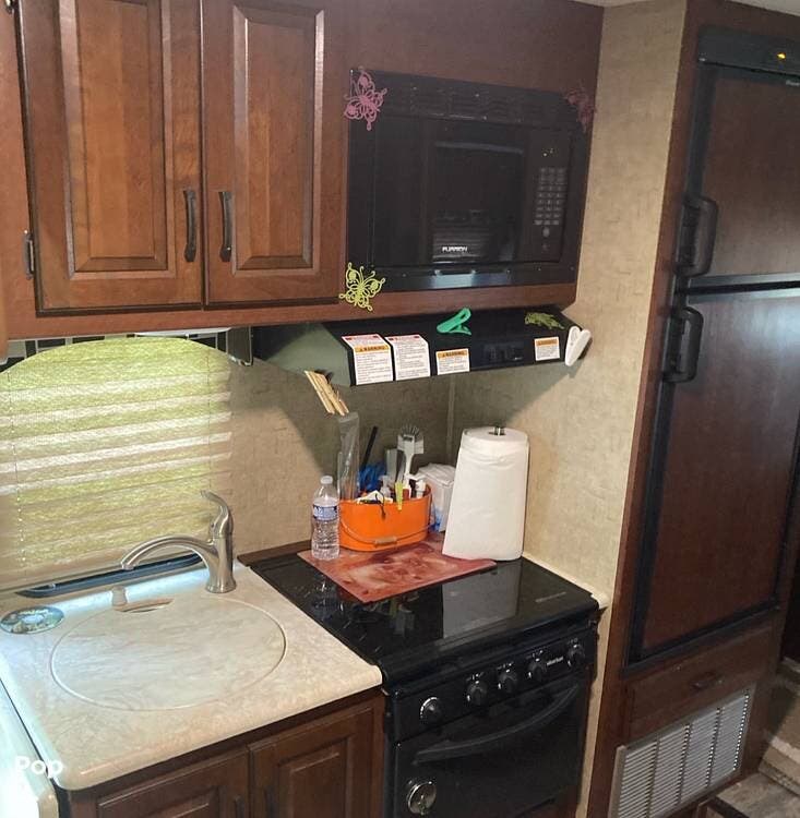 It features a gas/electric water heater, sound system, TV, DVD player, and a fully equipped kitchen. Including a microwave, refrigerator, oven/stove, and hooded fan!