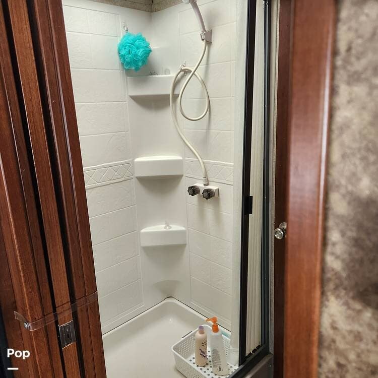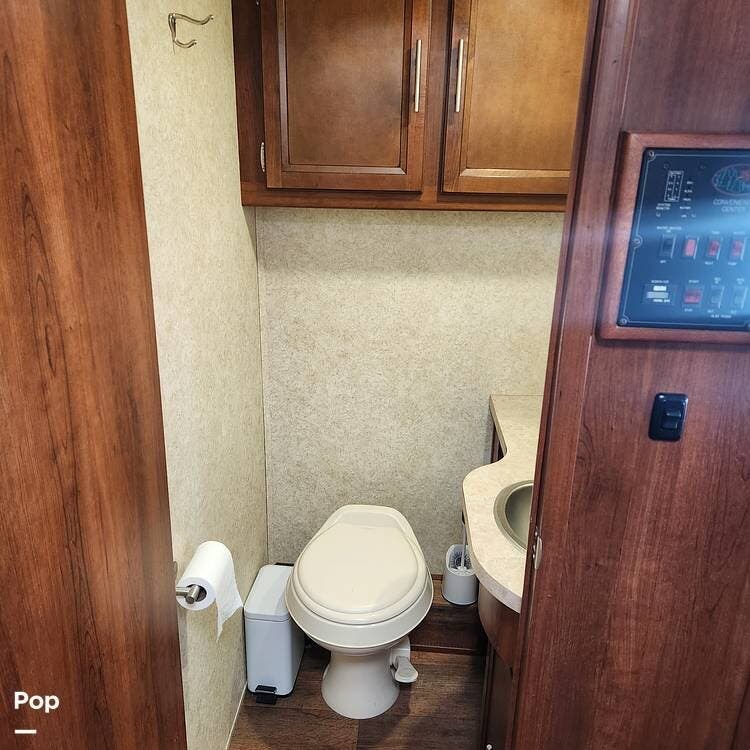 The split bathroom layout provides added privacy, with a private toilet and sink on one side of the coach and a separate shower located across the hall.