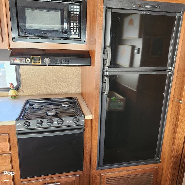 Stepping inside, the main living area offers a well-equipped kitchen with a double sink, three-burner cooktop with oven, microwave, refrigerator, and a 32" LED TV positioned for easy viewing. Across from the kitchen is a large slide-out housing a reclining hide-a-bed sofa and a wraparound booth dinette that easily converts into additional sleeping space.