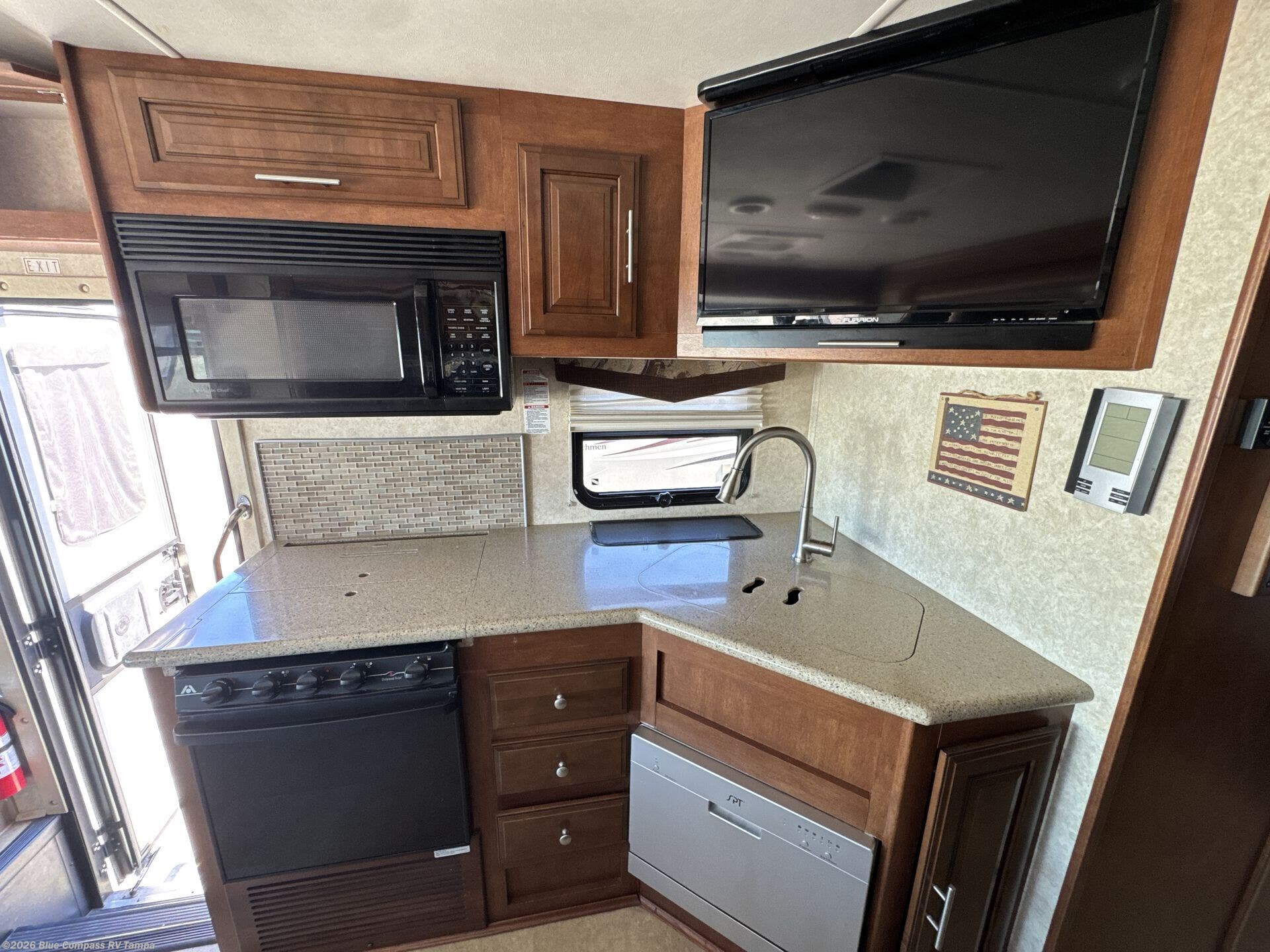 Stepping inside the motor home, to the left there is a three burner range, microwave, and double kitchen sink. The slide is on the opposite side of the motor home. On the slide you will find a u-dinette, refrigerator, pantry, and wardrobe. You can choose an optional hide-a-bed sofa in place of the dinette.