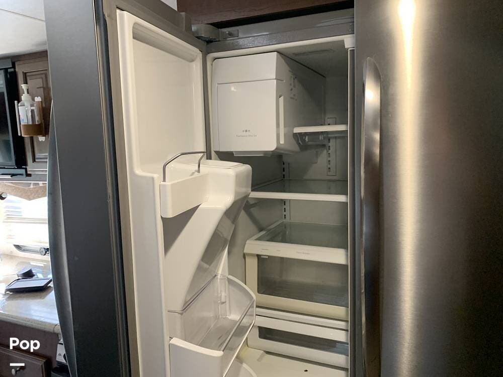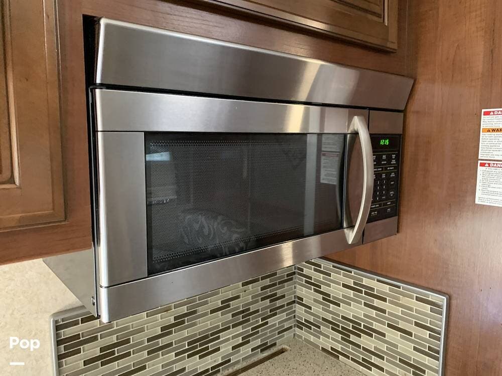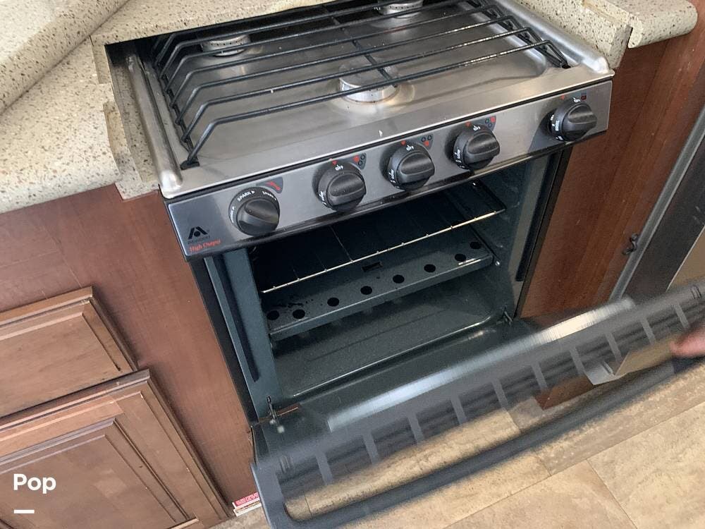 This RV has plenty of storage outside and within the coach area. The kitchen has a full-size residential refrigerator, a convection microwave, a three-burner stove, an oven, and a double sink, with plenty of solid-surface counter space.
