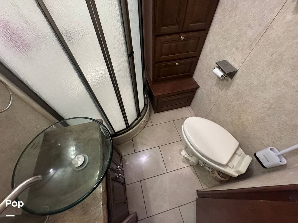 At the rear, the master bedroom offers a private retreat. A queen bed with overhead storage guarantees restful nights, while the wardrobe, built-in TV, and washer/dryer combo add convenience. The mid-coach bathroom, featuring a corner shower, linen closet, lavatory, and toilet, provides three-way privacy isolation, ensuring luxury on the road.