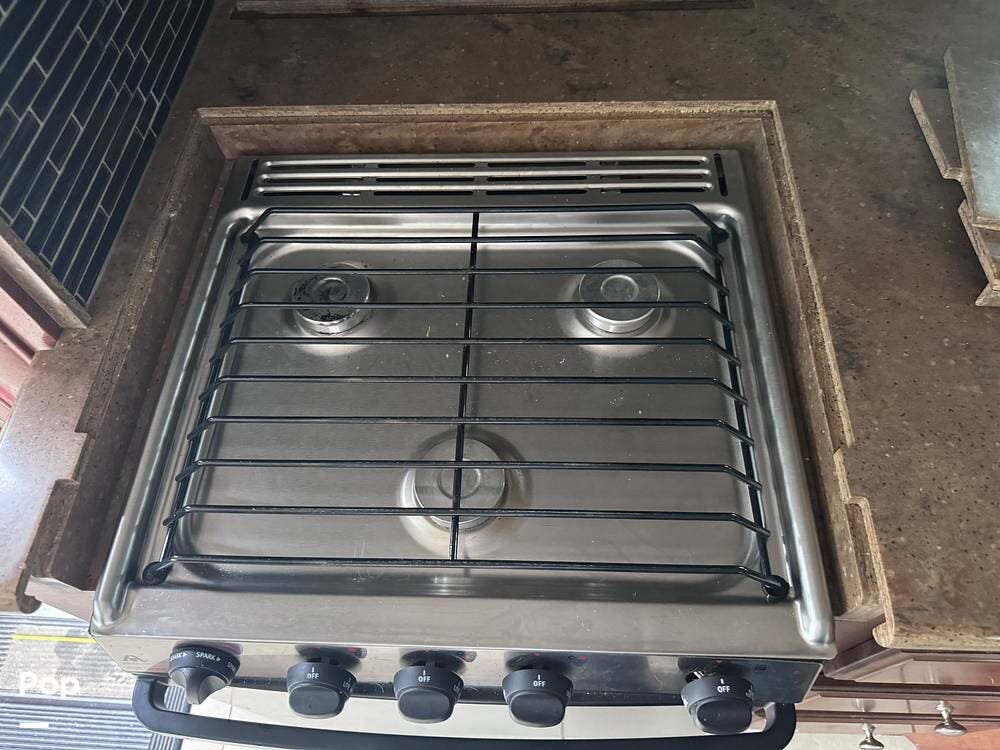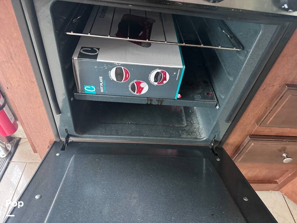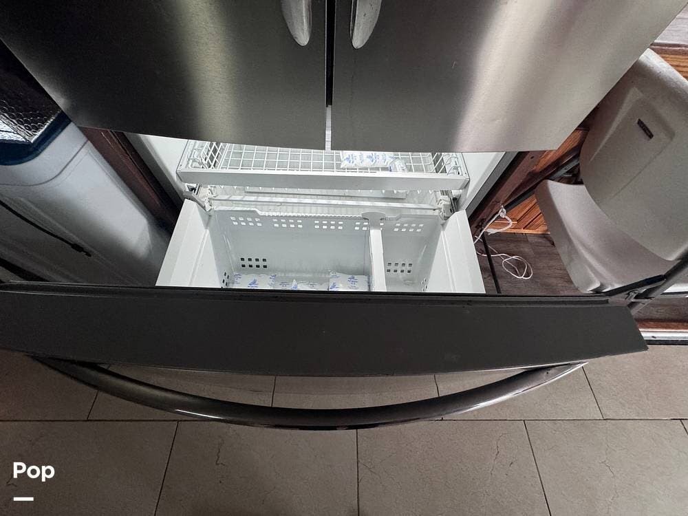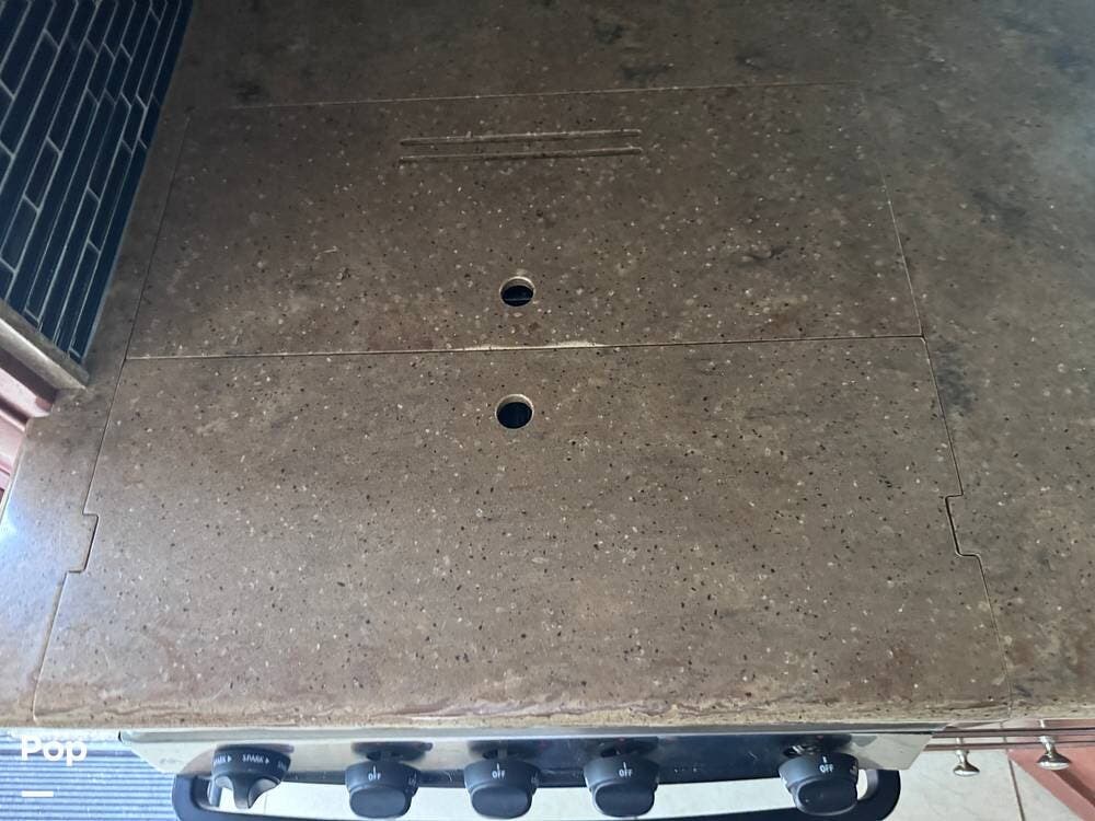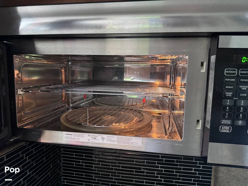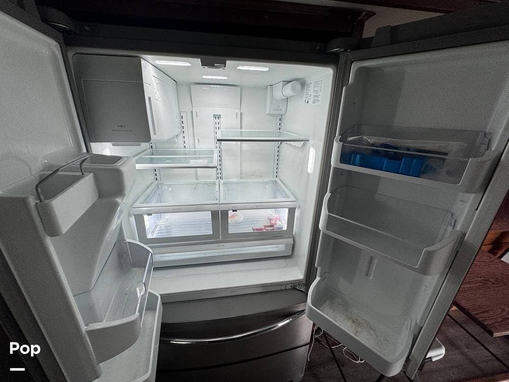 The kitchen is a chef's dream, equipped with a microwave oven, dual-bowl sink, stainless steel residential refrigerator, 3-burner gas stove, and oven. Solid surface countertops, a spacious three-door refrigerator/freezer with an icemaker, ample cabinet space, and a slide-out pantry make meal prep a breeze.