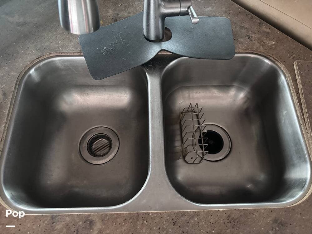 Dual stainless steel kitchen sink with flip-up counter extension.