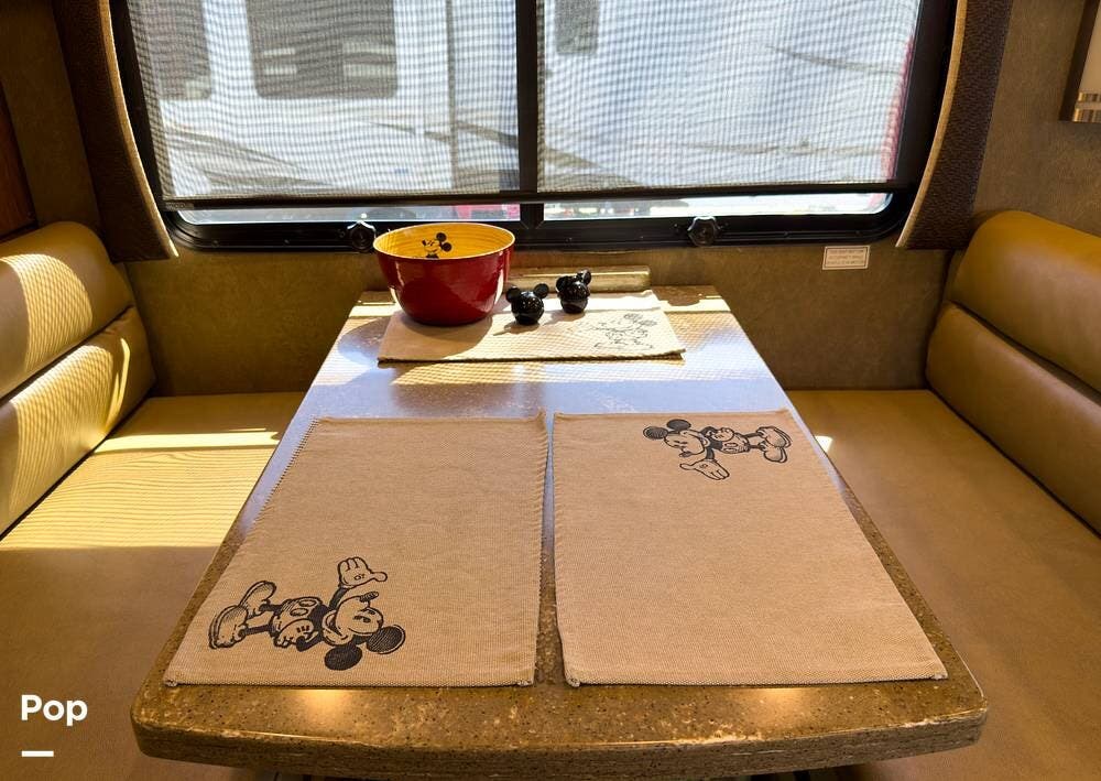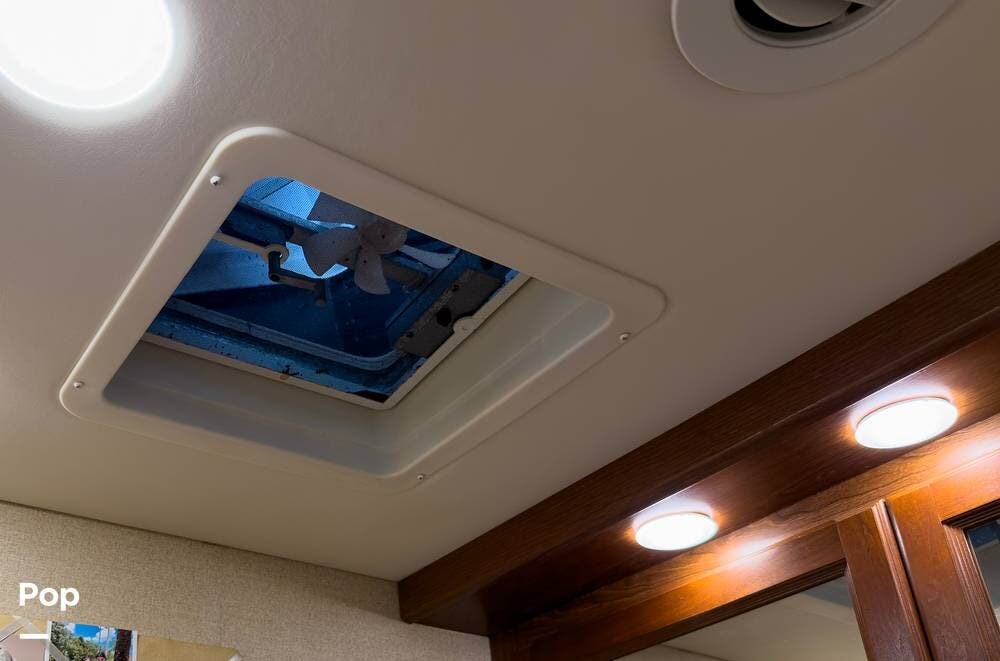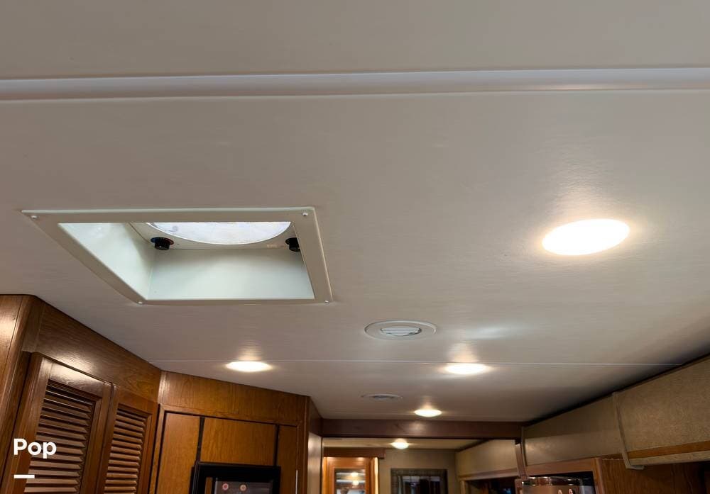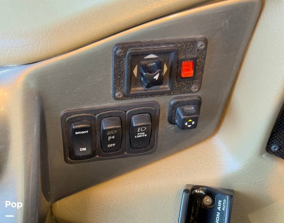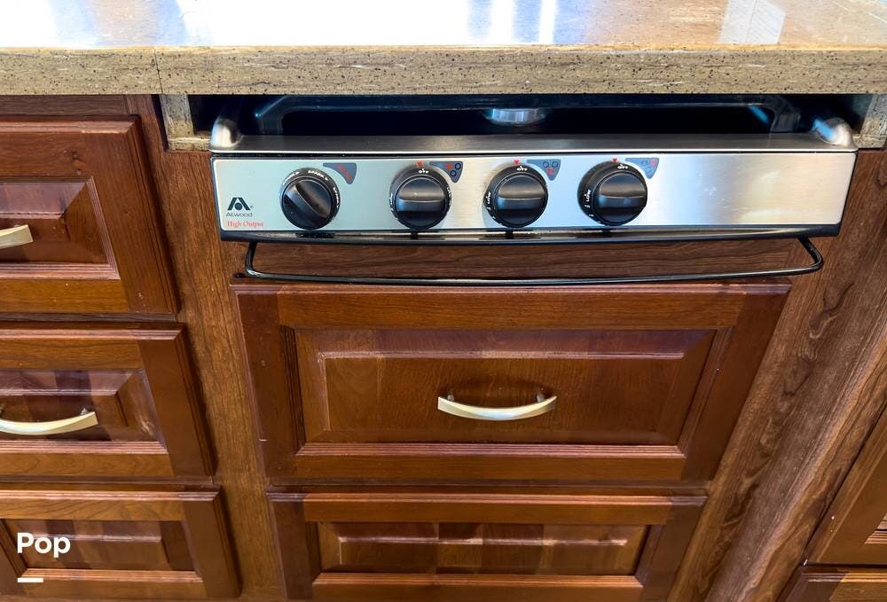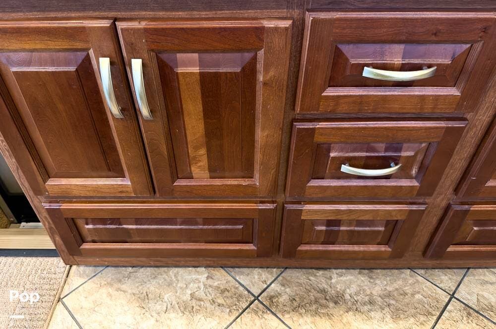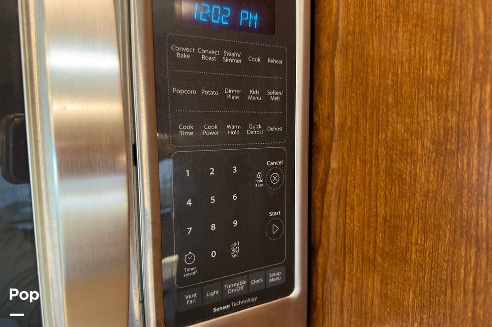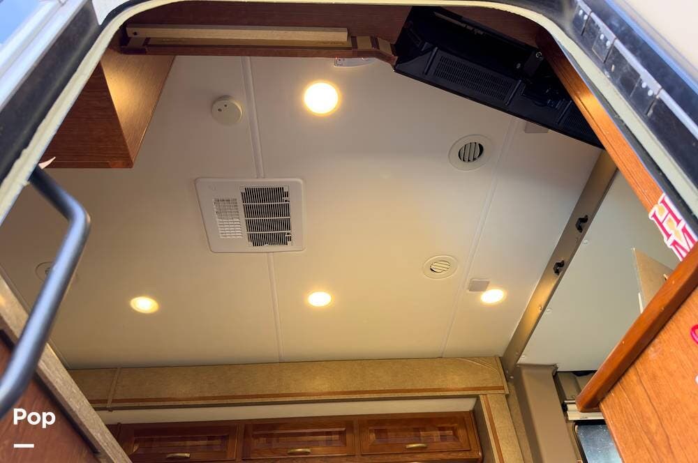 Inside, the quality of the cabinetry and finish stands out immediately. Solid hardwood cabinets, tile flooring, and solid-surface countertops give the interior a warm, residential feel. The living area includes comfortable seating, a convertible dinette for additional sleeping, and a power drop-down bunk over the cockpit for guests. Tinted windows, day/night shades, LED lighting, and a power windshield shade help maintain comfort and privacy.