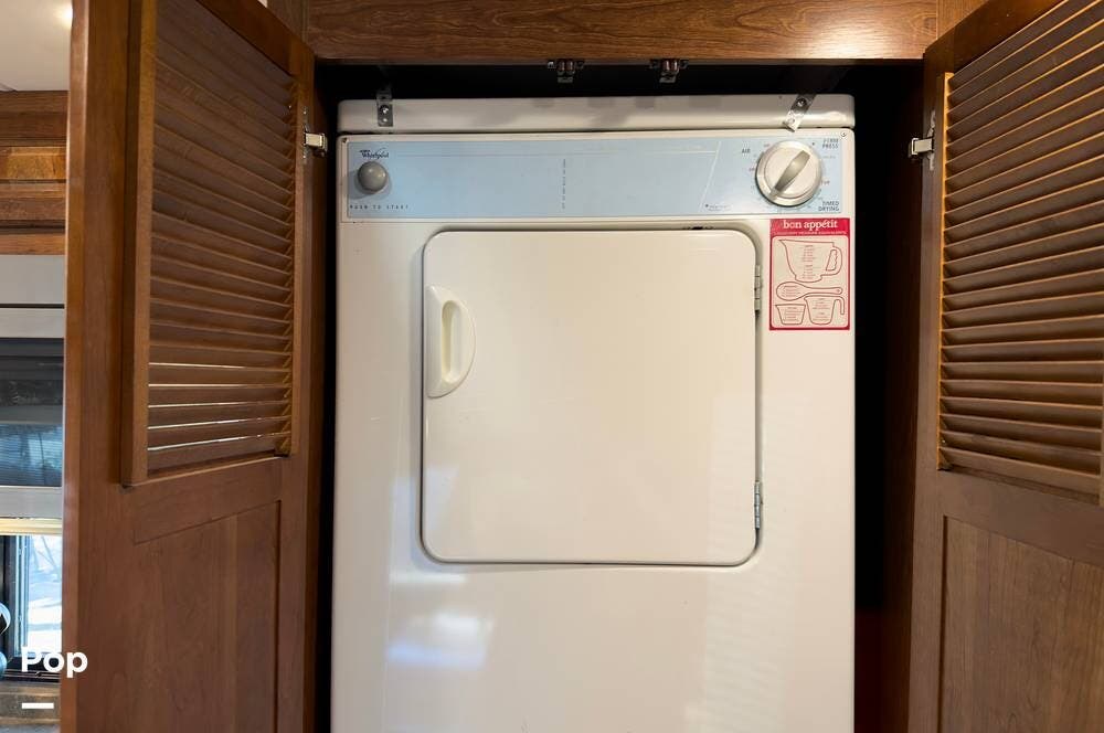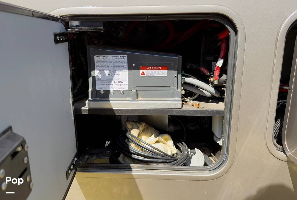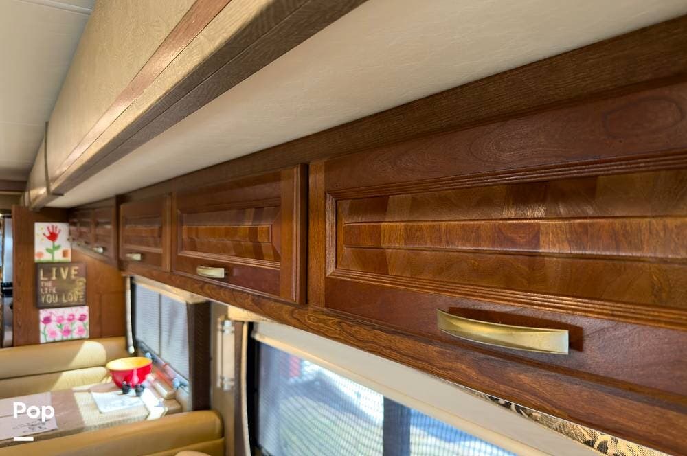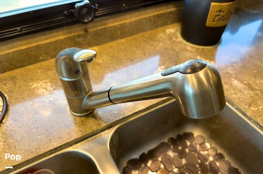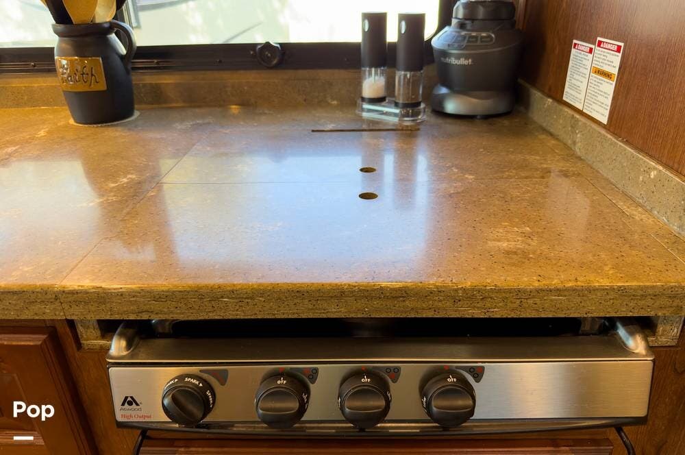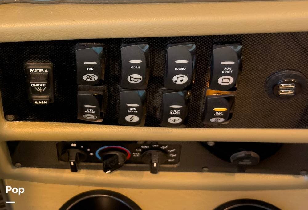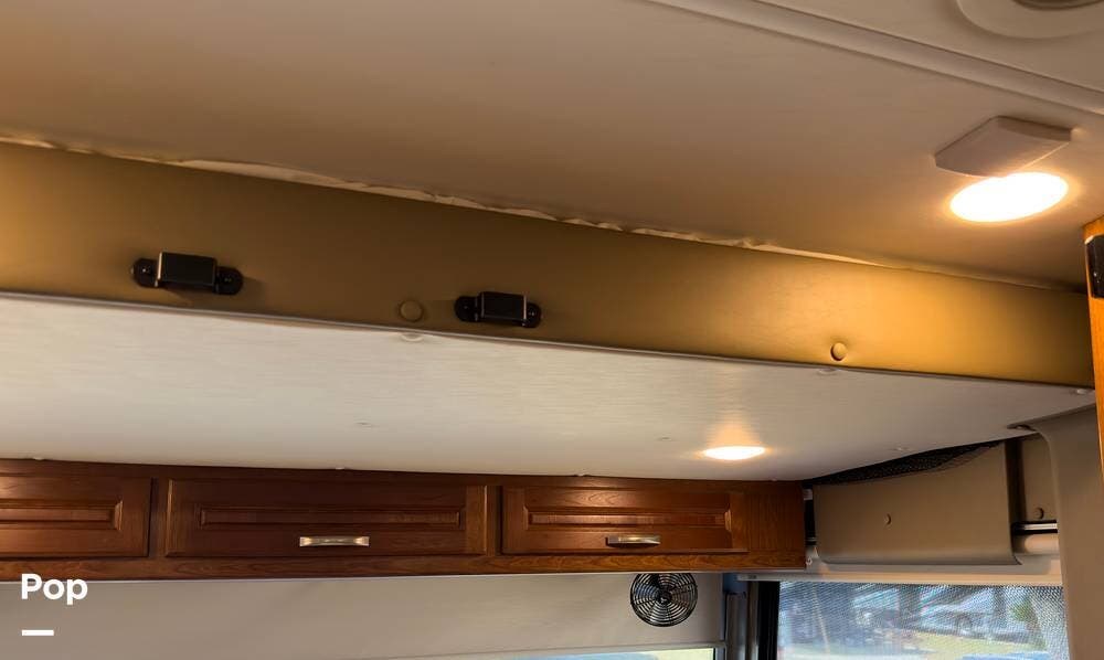 Inside, the quality of the cabinetry and finish stands out immediately. Solid hardwood cabinets, tile flooring, and solid-surface countertops give the interior a warm, residential feel. The living area includes comfortable seating, a convertible dinette for additional sleeping, and a power drop-down bunk over the cockpit for guests. Tinted windows, day/night shades, LED lighting, and a power windshield shade help maintain comfort and privacy.