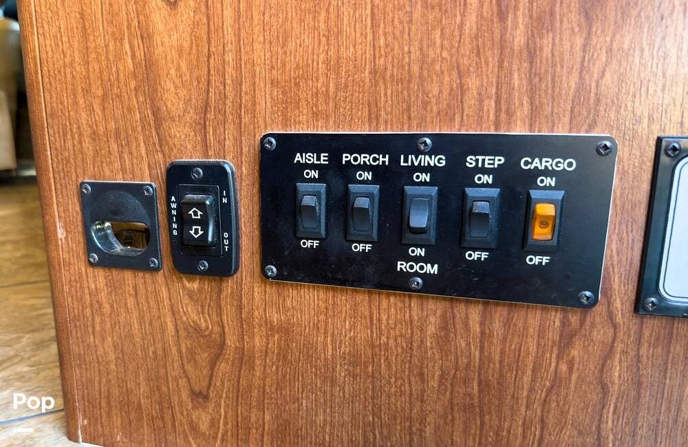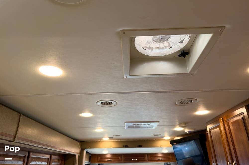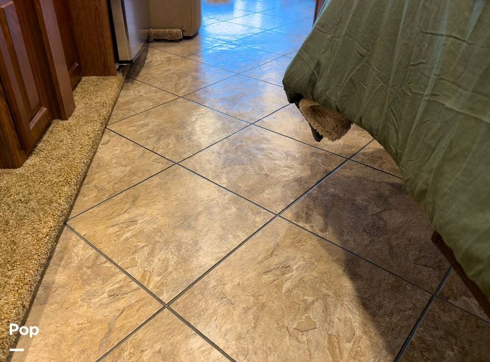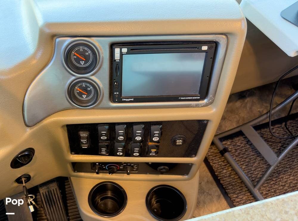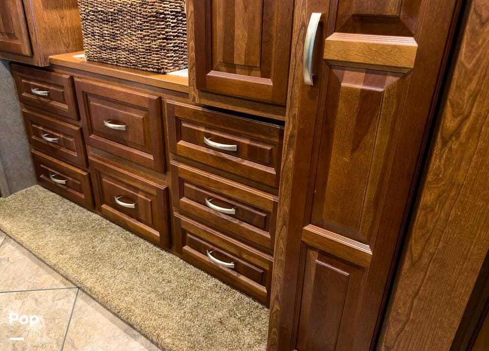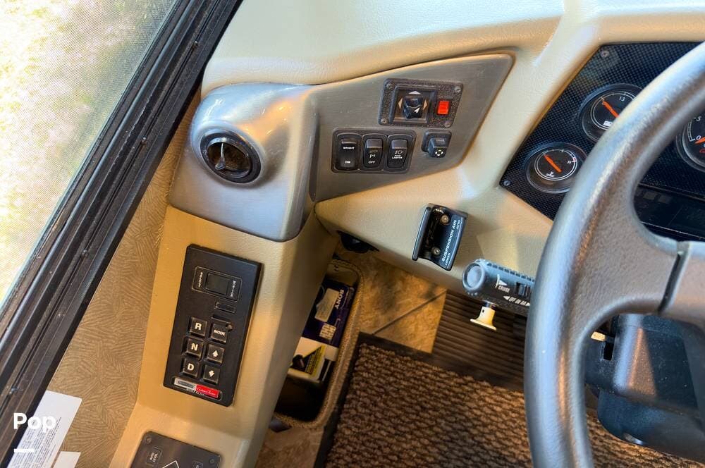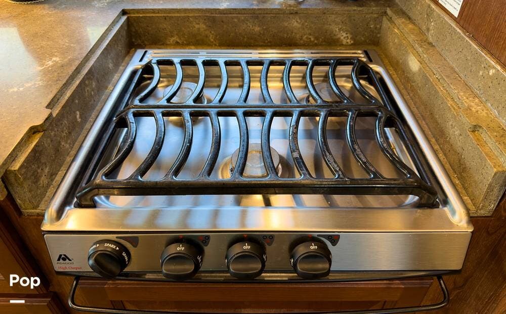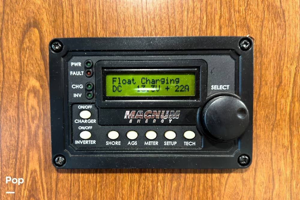Inside, the quality of the cabinetry and finish stands out immediately. Solid hardwood cabinets, tile flooring, and solid-surface countertops give the interior a warm, residential feel. The living area includes comfortable seating, a convertible dinette for additional sleeping, and a power drop-down bunk over the cockpit for guests. Tinted windows, day/night shades, LED lighting, and a power windshield shade help maintain comfort and privacy.