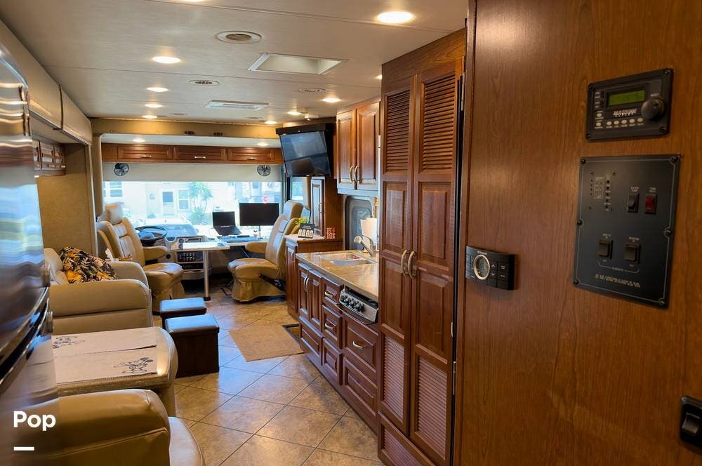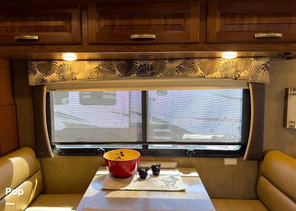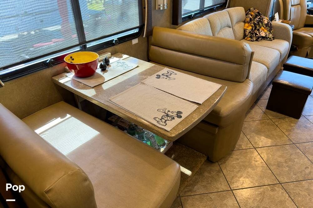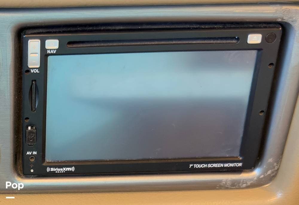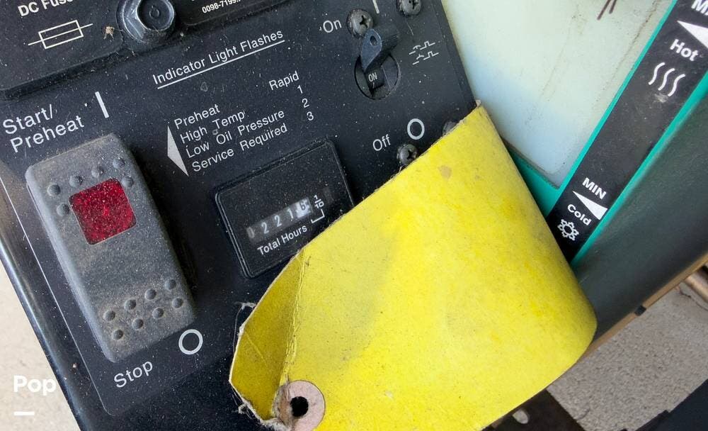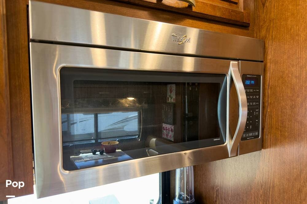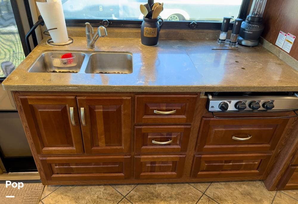 Inside, the quality of the cabinetry and finish stands out immediately. Solid hardwood cabinets, tile flooring, and solid-surface countertops give the interior a warm, residential feel. The living area includes comfortable seating, a convertible dinette for additional sleeping, and a power drop-down bunk over the cockpit for guests. Tinted windows, day/night shades, LED lighting, and a power windshield shade help maintain comfort and privacy.