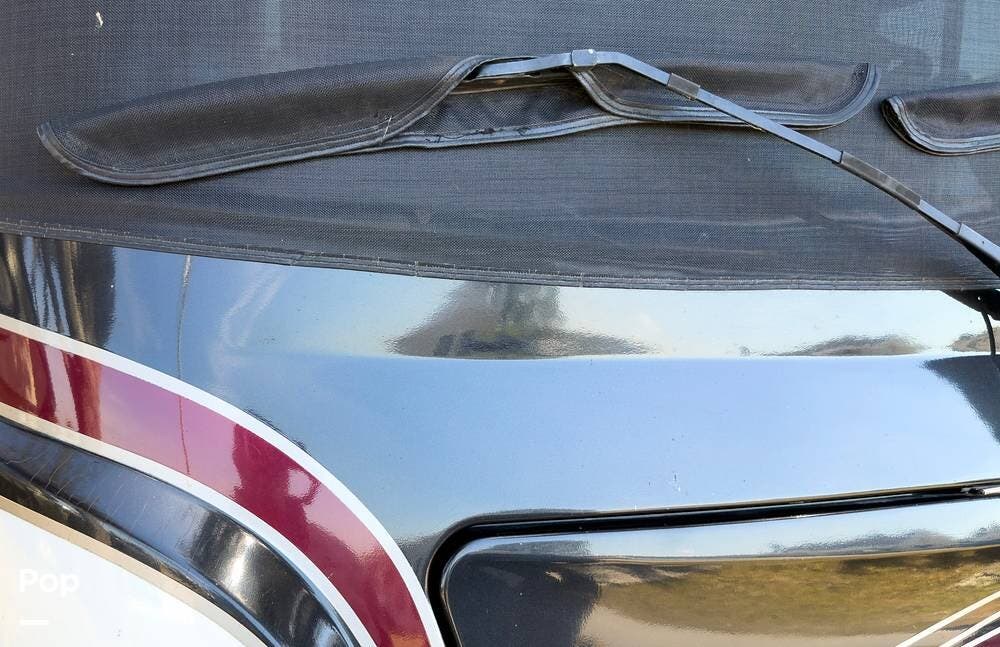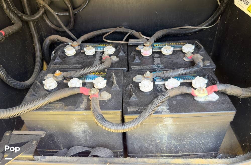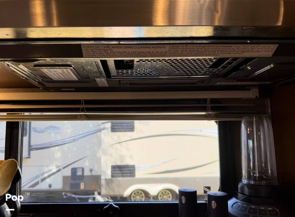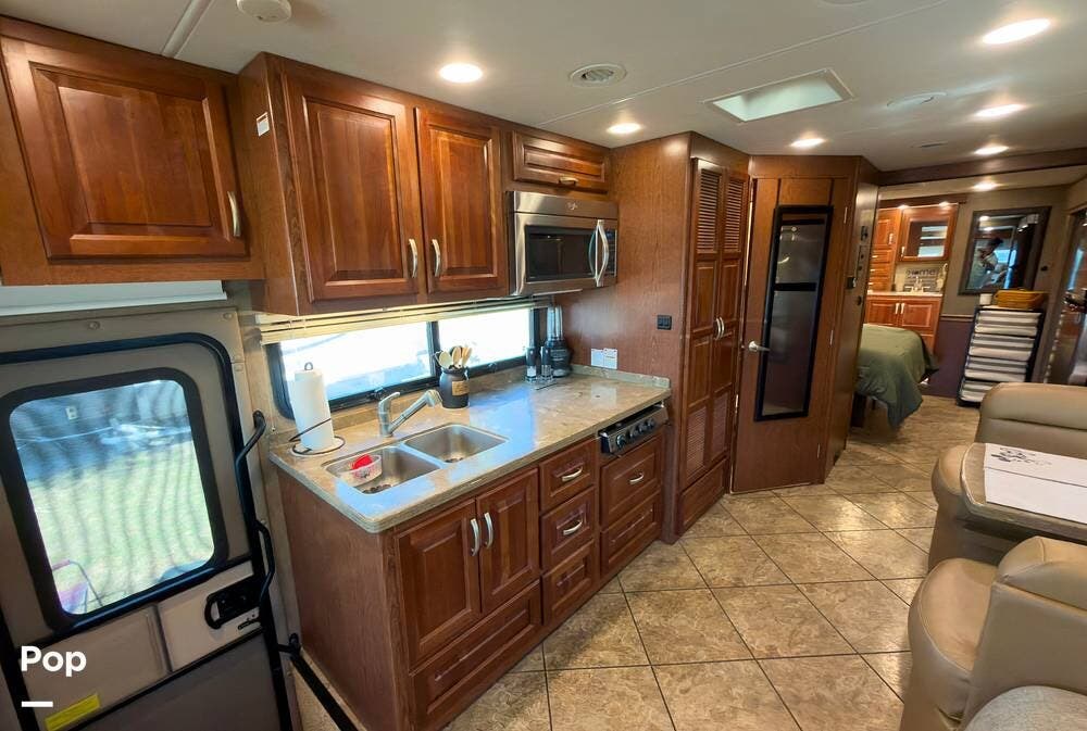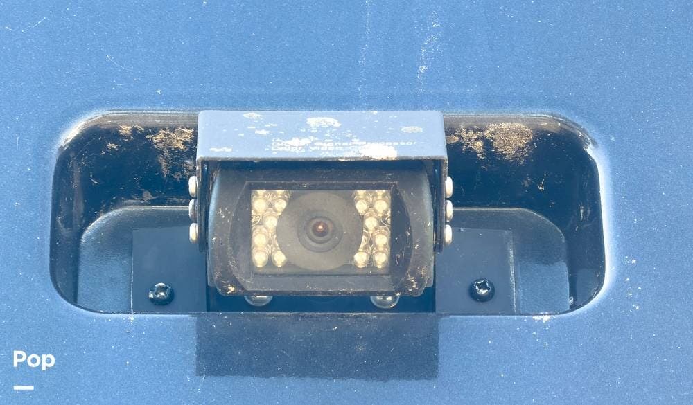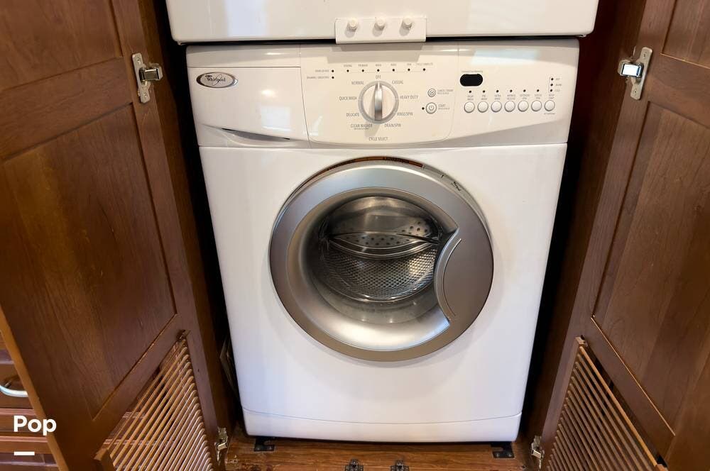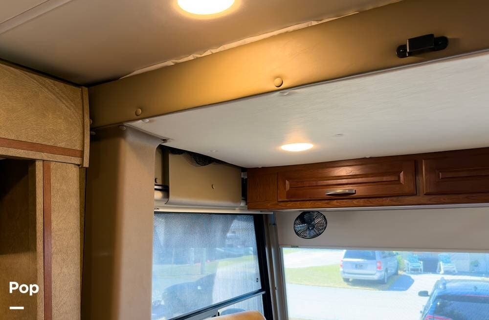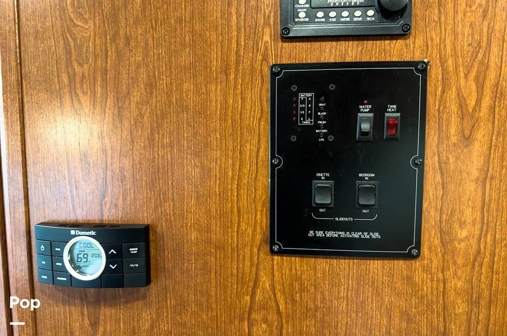 Inside, the quality of the cabinetry and finish stands out immediately. Solid hardwood cabinets, tile flooring, and solid-surface countertops give the interior a warm, residential feel. The living area includes comfortable seating, a convertible dinette for additional sleeping, and a power drop-down bunk over the cockpit for guests. Tinted windows, day/night shades, LED lighting, and a power windshield shade help maintain comfort and privacy.