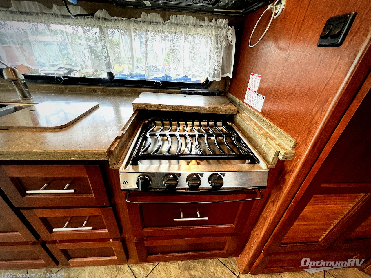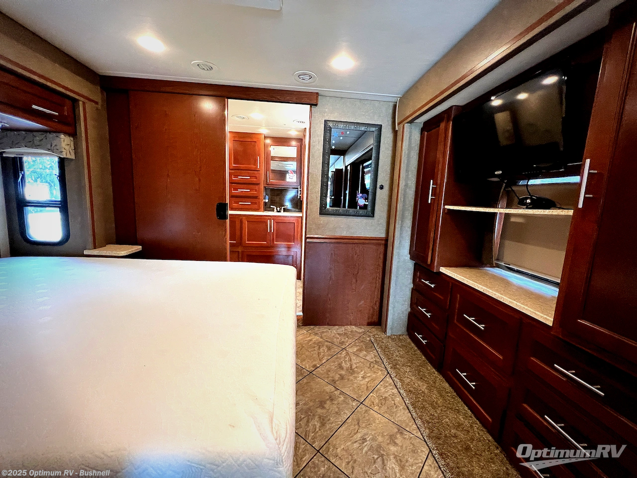 As you enter the motor home, the passenger side has a 32" LED TV, double kitchen sink, three burner range, microwave, and is washer and dryer prepped. The driver's side of the motor home offers a full wall slide with a sofa, booth dinette, refrigerator, pantry with adjustable shelves, closet, two shirt wardrobes, a chest of drawers, and a LED TV in the bedroom.