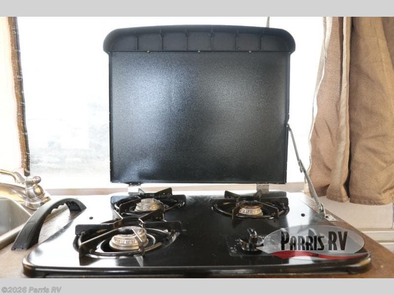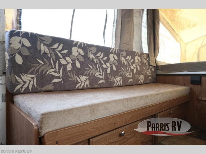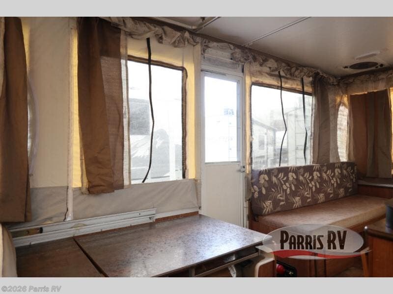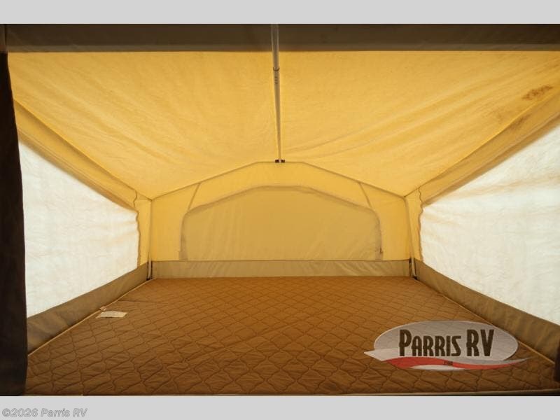 The front king and rear queen tent end beds offer comfortable sleeping. Inside you will find a gaucho/bed to the left. Across, a booth dinette includes a table extension. The back wall also holds a swing galley with single bowl sink, three burner stove top, and optional refrigerator. A cabinet in the corner offers extra storage.