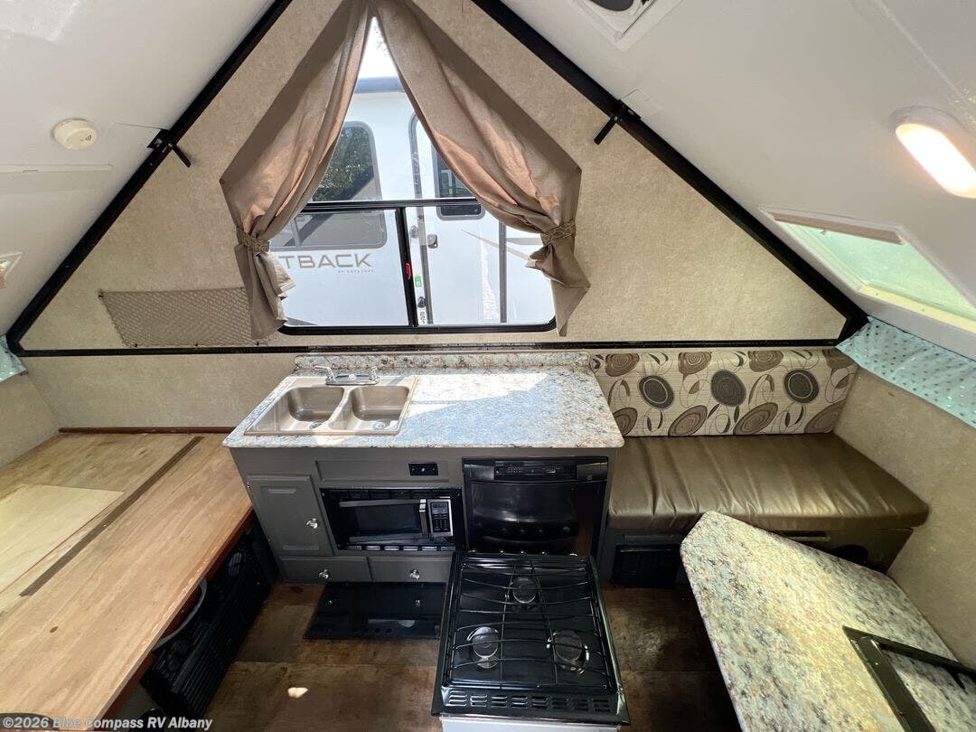 As you enter the A212HW Rockwood Hard Side folding pop-up camper by Forest River, you will find that there is a 50" x 80" front dinette. Along one side of the camper there is a XL refrigerator, double kitchen sink, and microwave. Across from the sink you will find a three burner range and oven. Along the rear of the camper you can enjoy a good night's rest on the 60" x 80" flip-up bed.