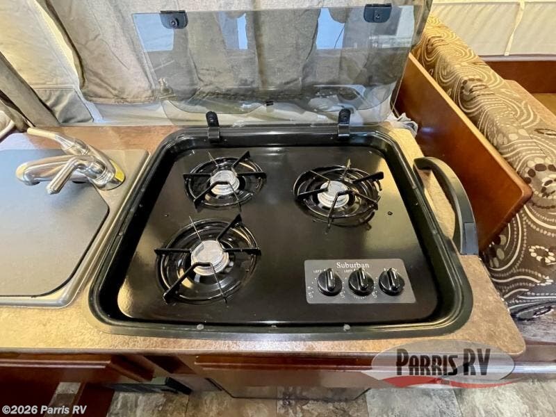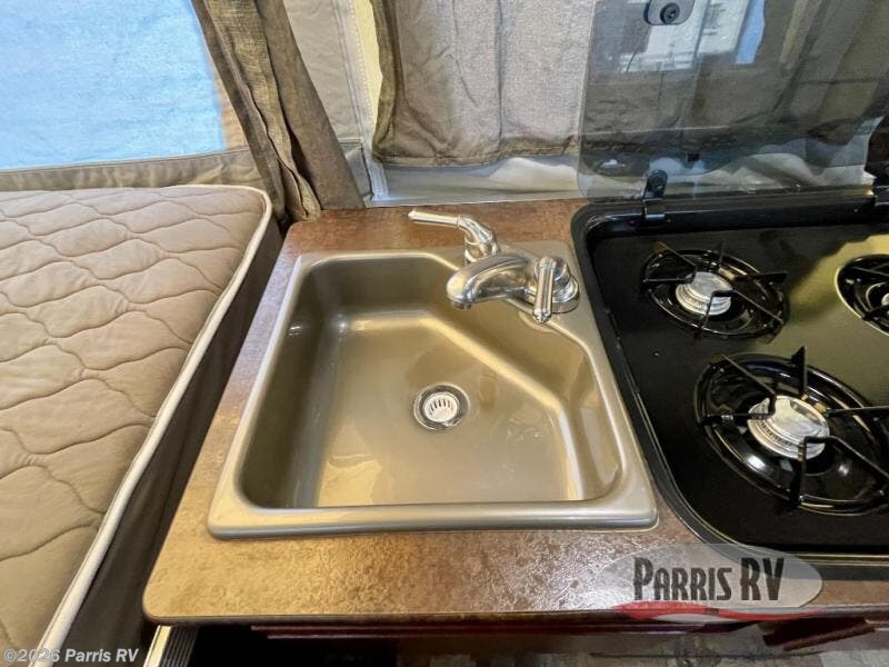 As you continue around, a 72" x 50" booth dinette is located within the single slide out. Back inside, one back corner provides a swing level galley with a cabinet, three burner range top and single bowl sink. An optional refrigerator is under the three burner range.