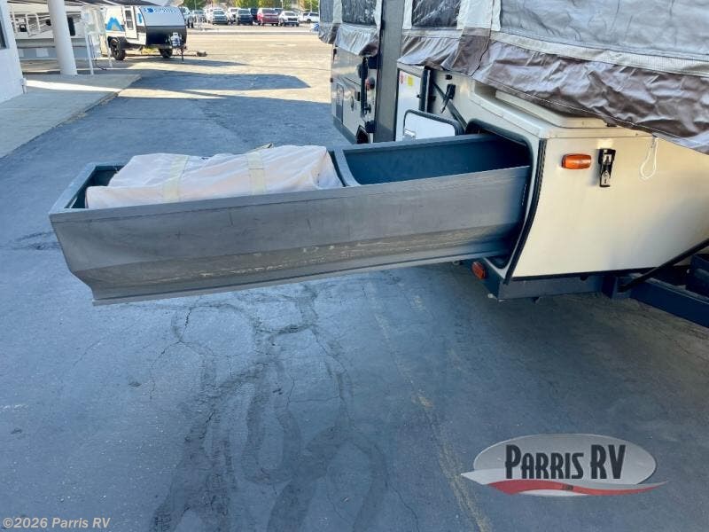 Outside this folding pop-up camper is sliding storage for easy access, an awning and a RVQue gas grill.