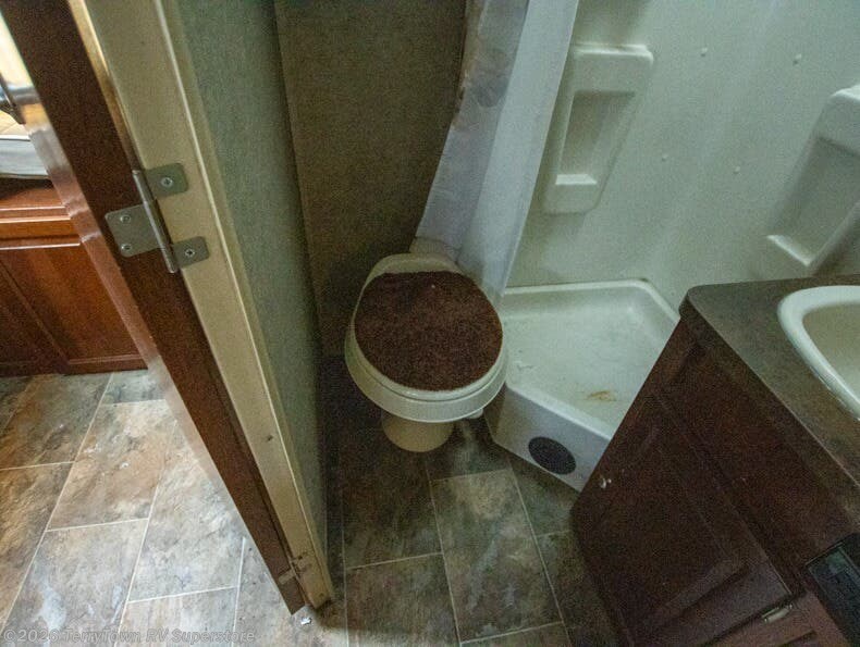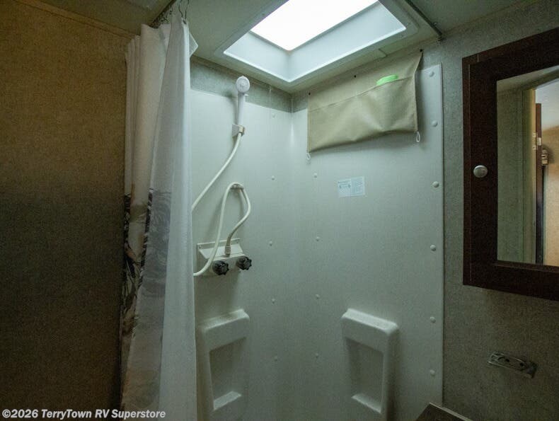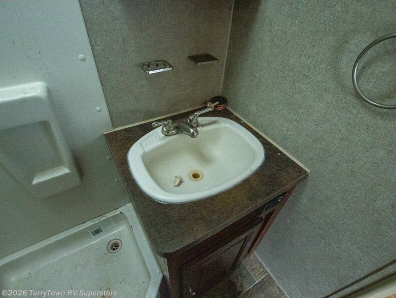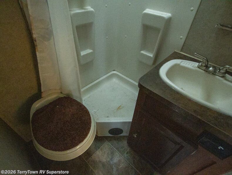 In the rear bathroom you will find a toilet, shower, sink and medicine cabinet.
