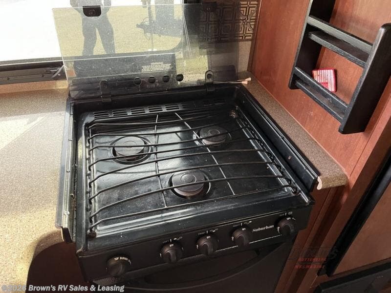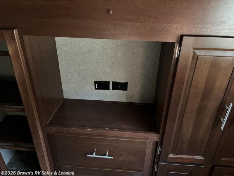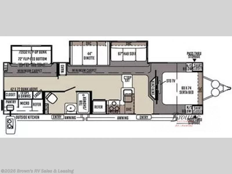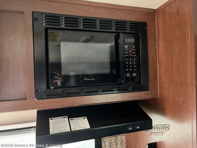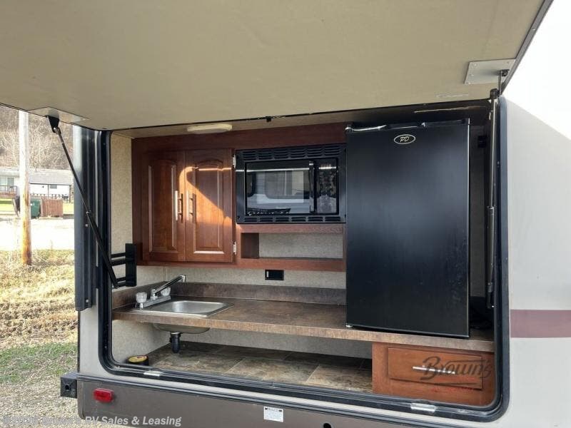 You will find plenty of storage in the travel trailer with all of the overhead cabinets, and the large exterior pass thru storage area. You can enjoy the outside kitchen which offers a two burner range, pantry, microwave, and refrigerator. There is even an optional grill and an optional rear ladder that you can choose.