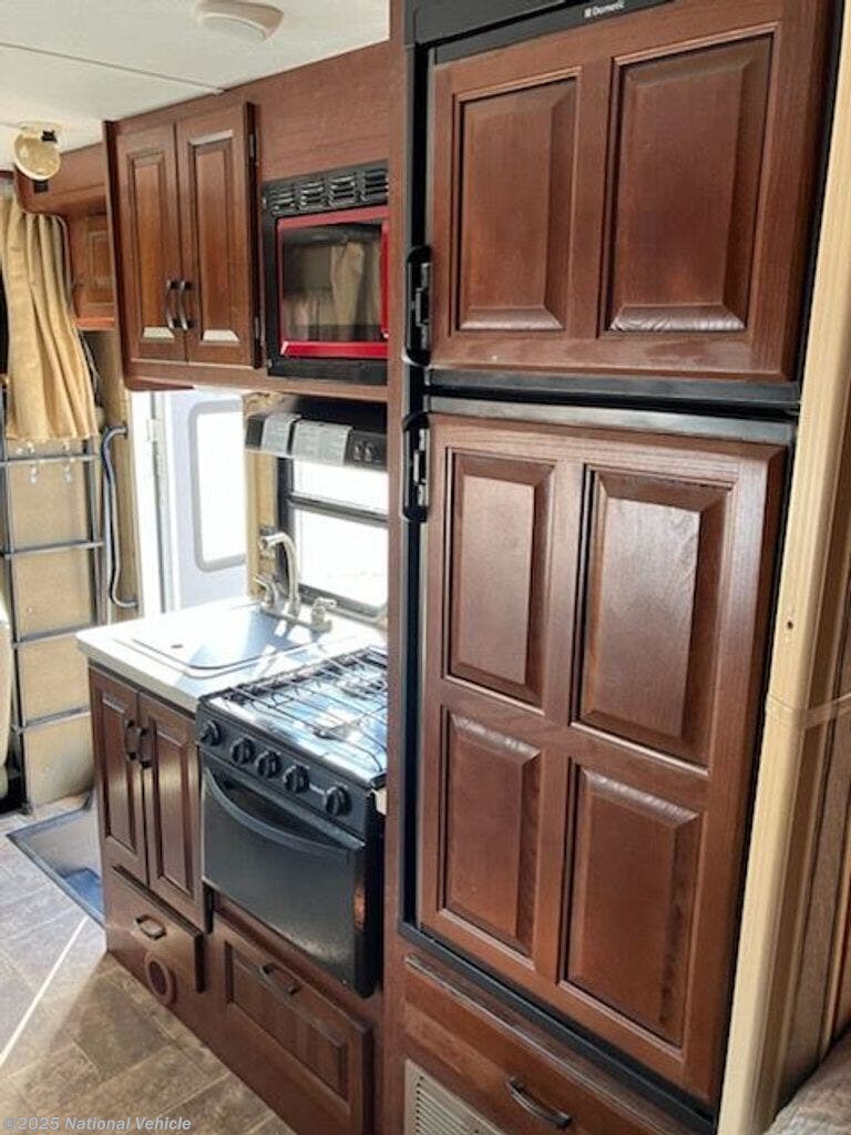 The kitchen features a refrigerator, three burner range with overhead microwave, single galley sink with overhead cabinets and a flip down counter extension. A u-dinette with overhead cabinets is located opposite the kitchen.