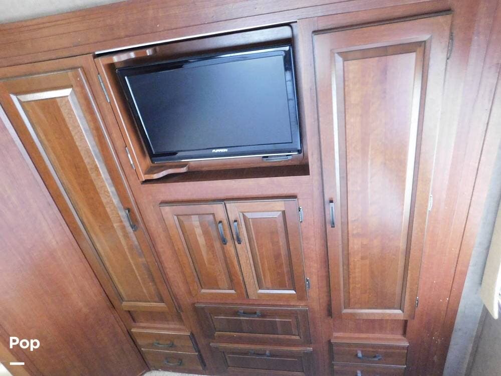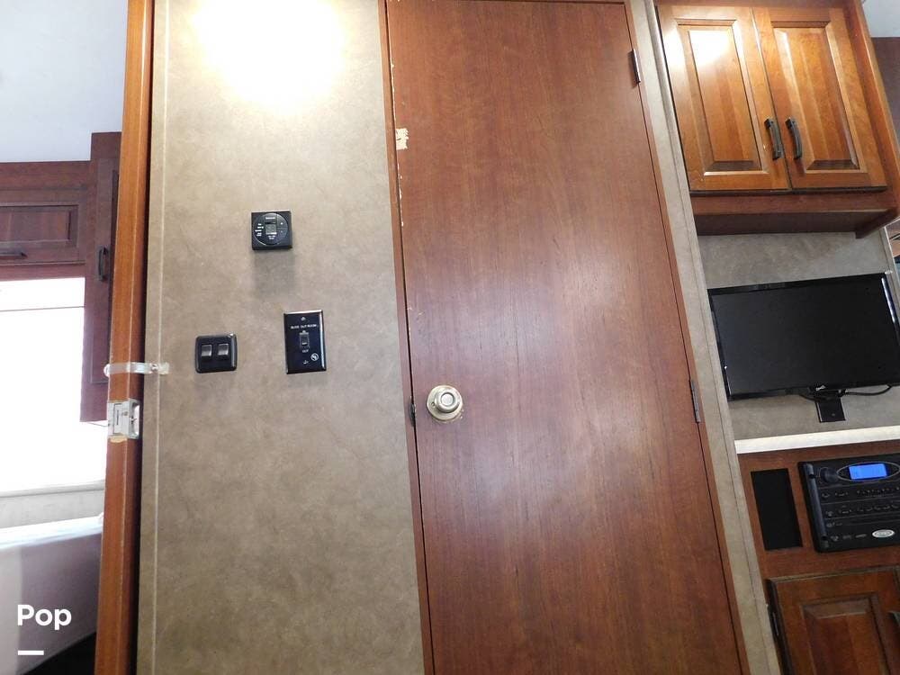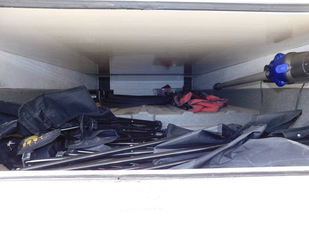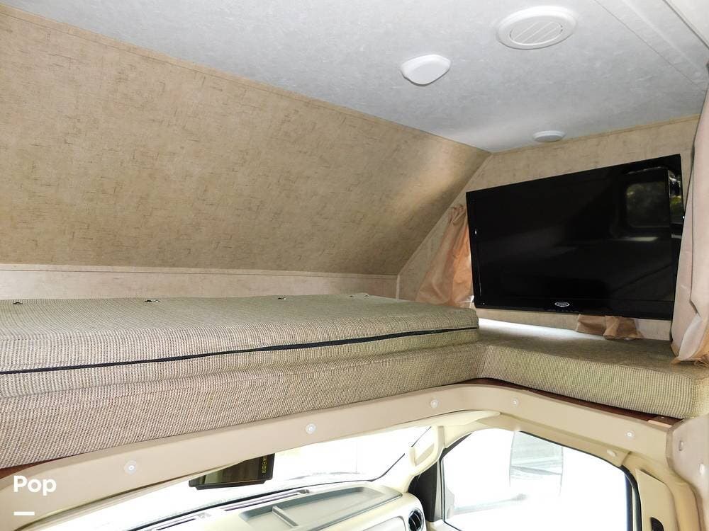 At the front, above the cab, there is a spacious bunk area suitable for children or guests. The bunkhouse features a twin bed up and a jackknife sofa below facing the TV and stereo, making the perfect retreat for the little ones.