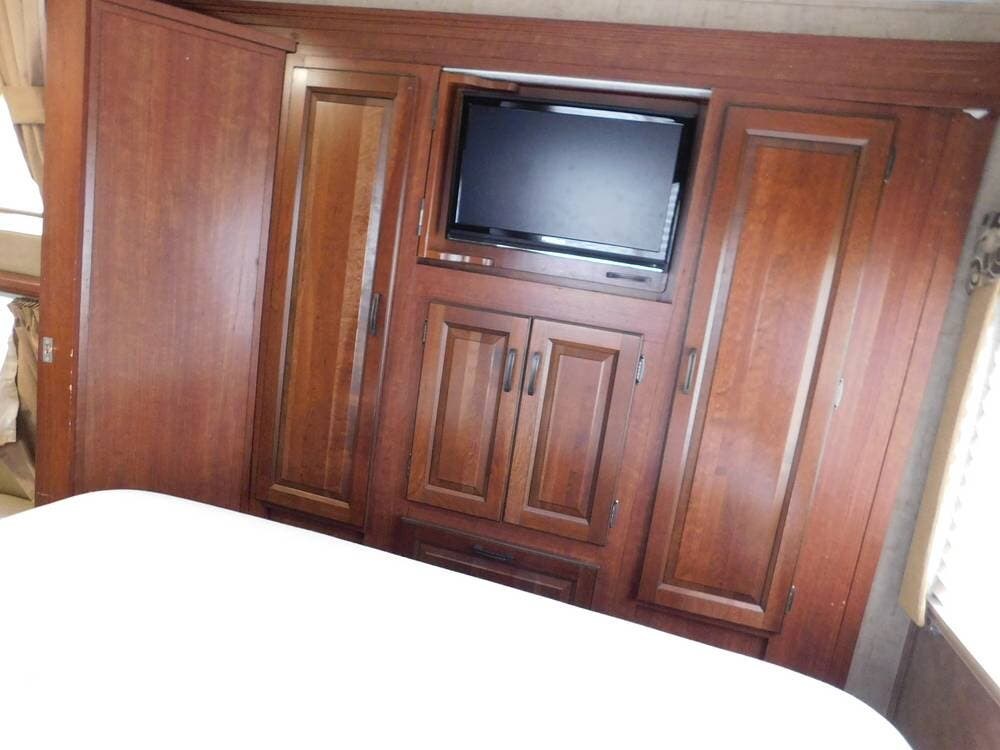 Sleeping accommodations are a highlight of the 3170DS. The rear bedroom features a queen-size bed, TV, overhead storage, and wardrobe closets for clothing and personal items.