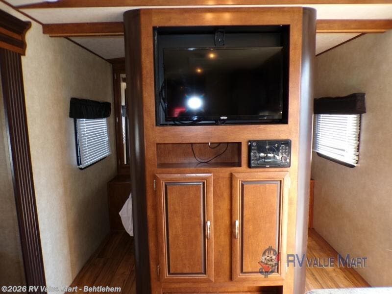 Toward the front of the trailer, just before you enter into the bedroom you will find an entertainment center. Inside the front bedroom there is a queen bed and wardrobes on either side of the bed.