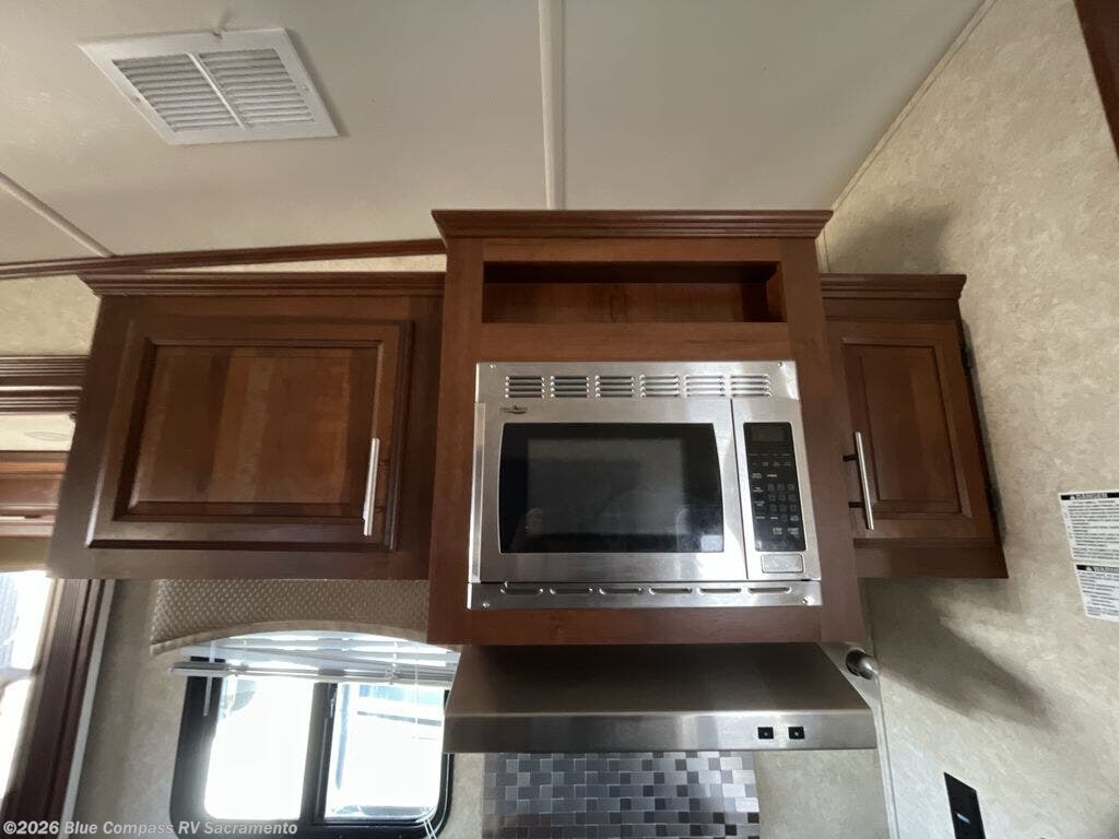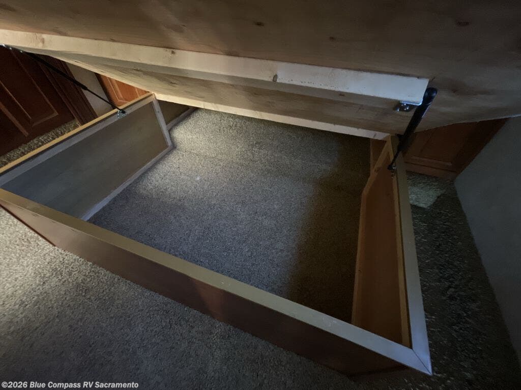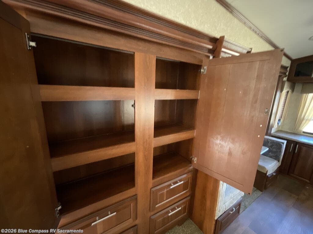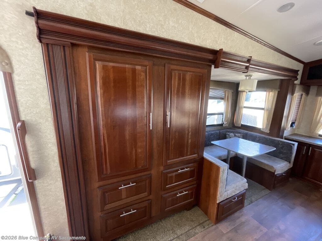 Not only are there overhead cabinets throughout the fifth wheel, there is also a pass through slam latch door for more storage.