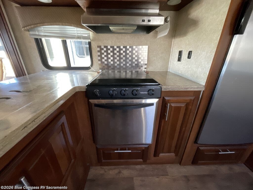 The 293REX Wildcat by Forest River features a rear wall entertainment with a cozy fireplace below the 39" LCD TV. On one side of the fifth wheel there is a u-shaped dinette and pantry with four drawers slide. On the other side you will find an air mattress hide-a-bed sofa slide. Both of these slides help to give more space in this fifth wheel. As you enter the kitchen you will notice that the kitchen has a linoleum floor. There is an l-shaped counter with a double kitchen sink, three burner range, microwave, and refrigerator.