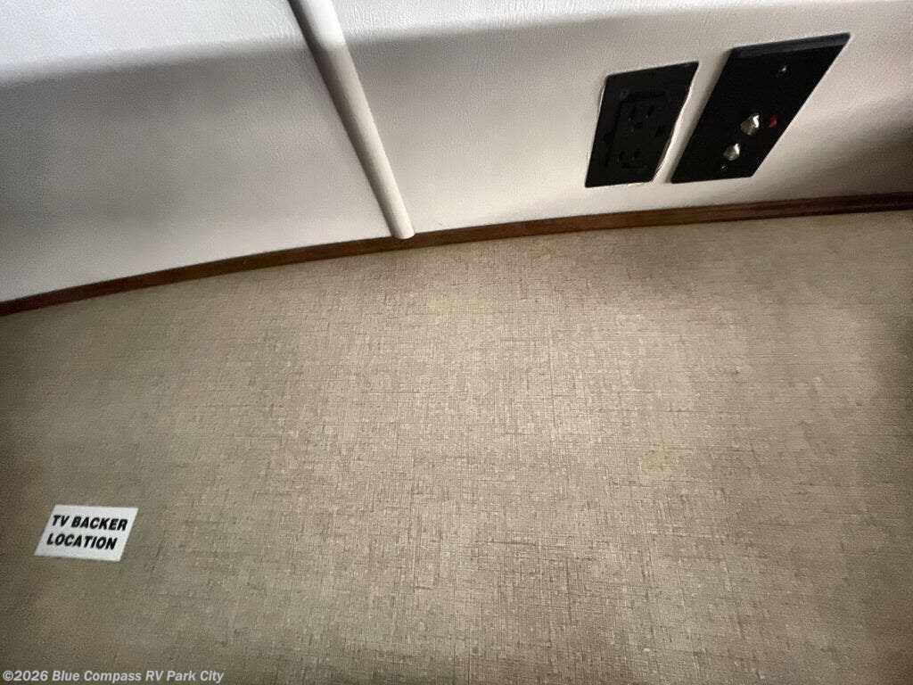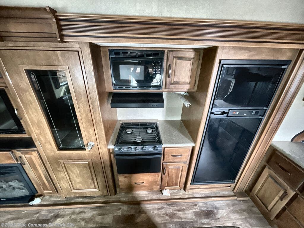 To your immediate left of the entrance you will see an optional dinette along with theater seating in a slide out. There is a center kitchen island which includes a double sink for easy food prep and cleanup. Directly opposite is a second larger slide featuring a refrigerator, a three burner range, and pantry for dry goods storage. This slide also features a entertainment center with 39" TV with overhead storage cabinets and fireplace. There is also a hutch with overhead storage straight in from the entrance to the right of the kitchen island.