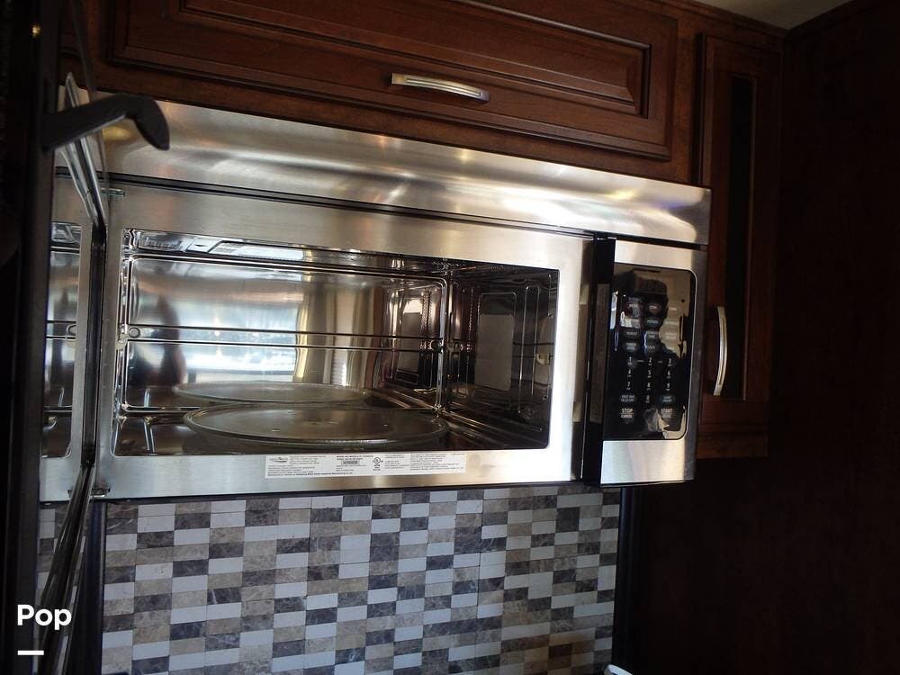 Features include three slide-outs, two ducted air conditioners, hydraulic jacks, an exterior stereo with speakers, two TVs, two propane tanks, an exterior shower, a convection microwave, and a 3-burner range with an oven.