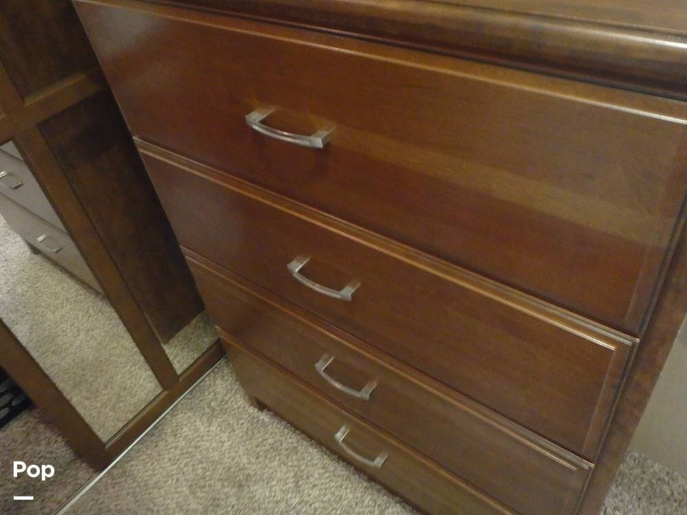 Exterior features include a power awning, pass-through storage compartments, and sturdy construction with a residential feel. It's built for comfort and durability, with modern finishes and high-quality materials used throughout.