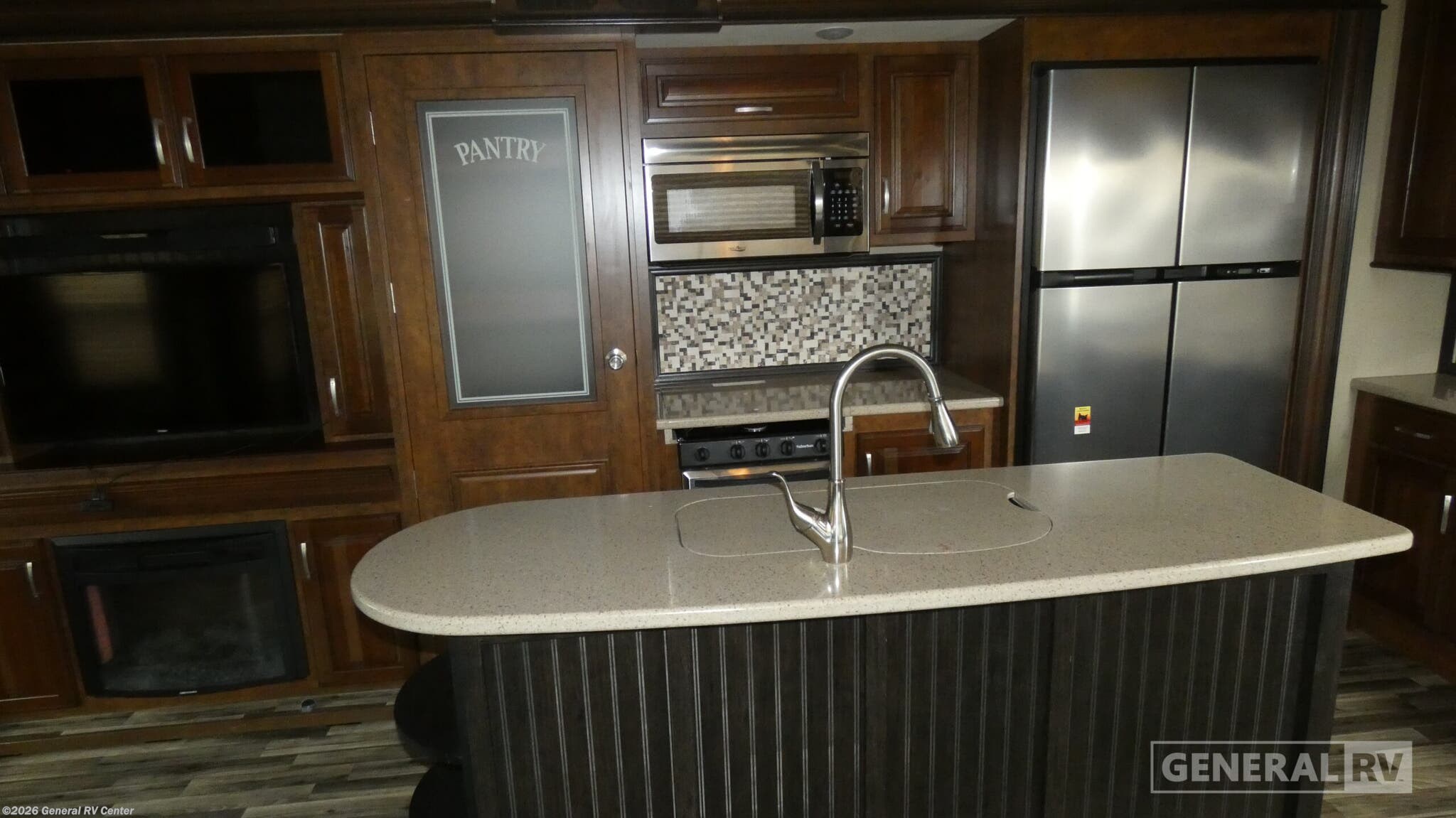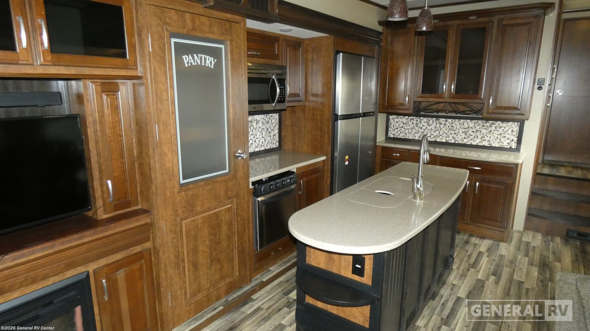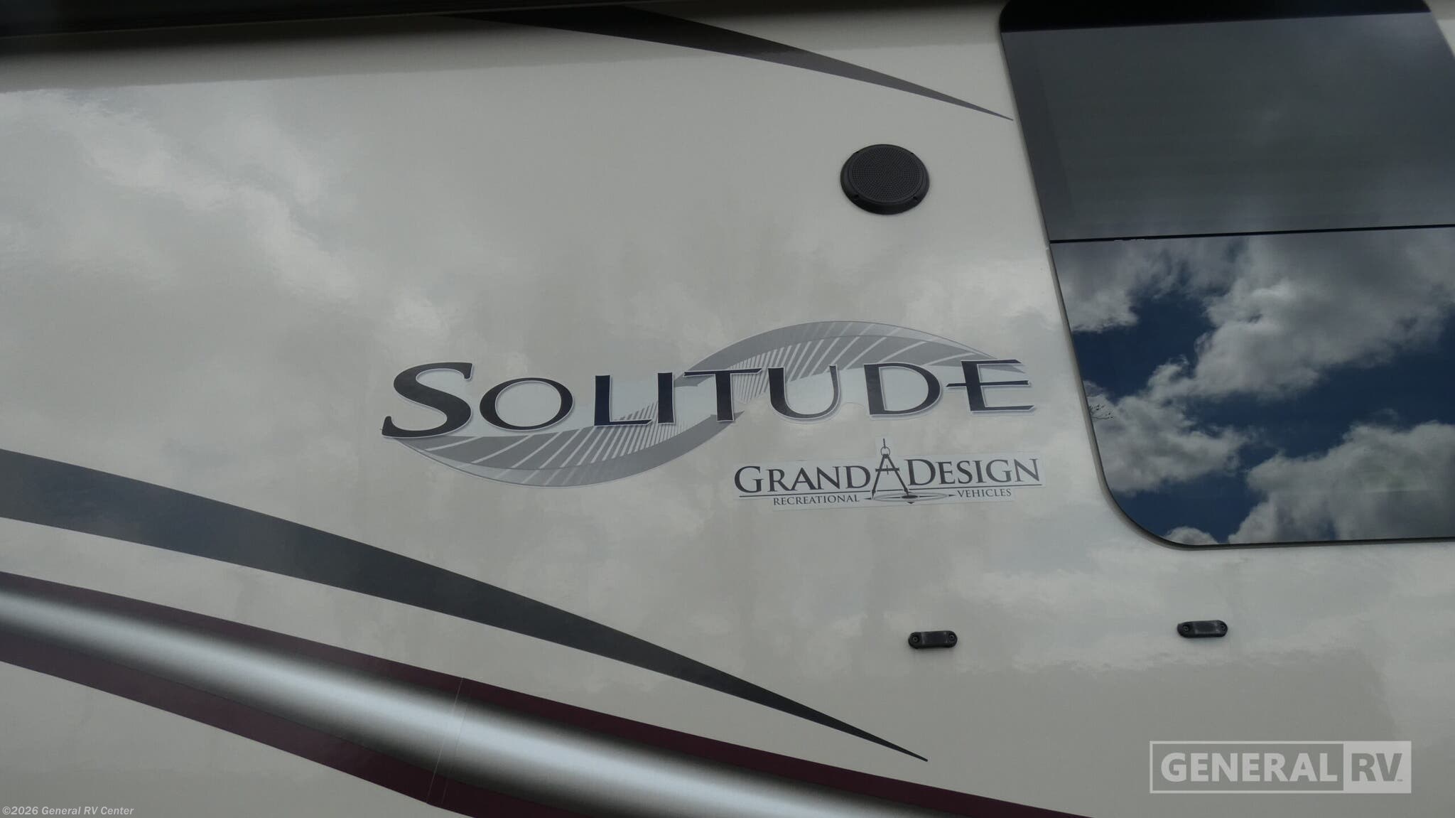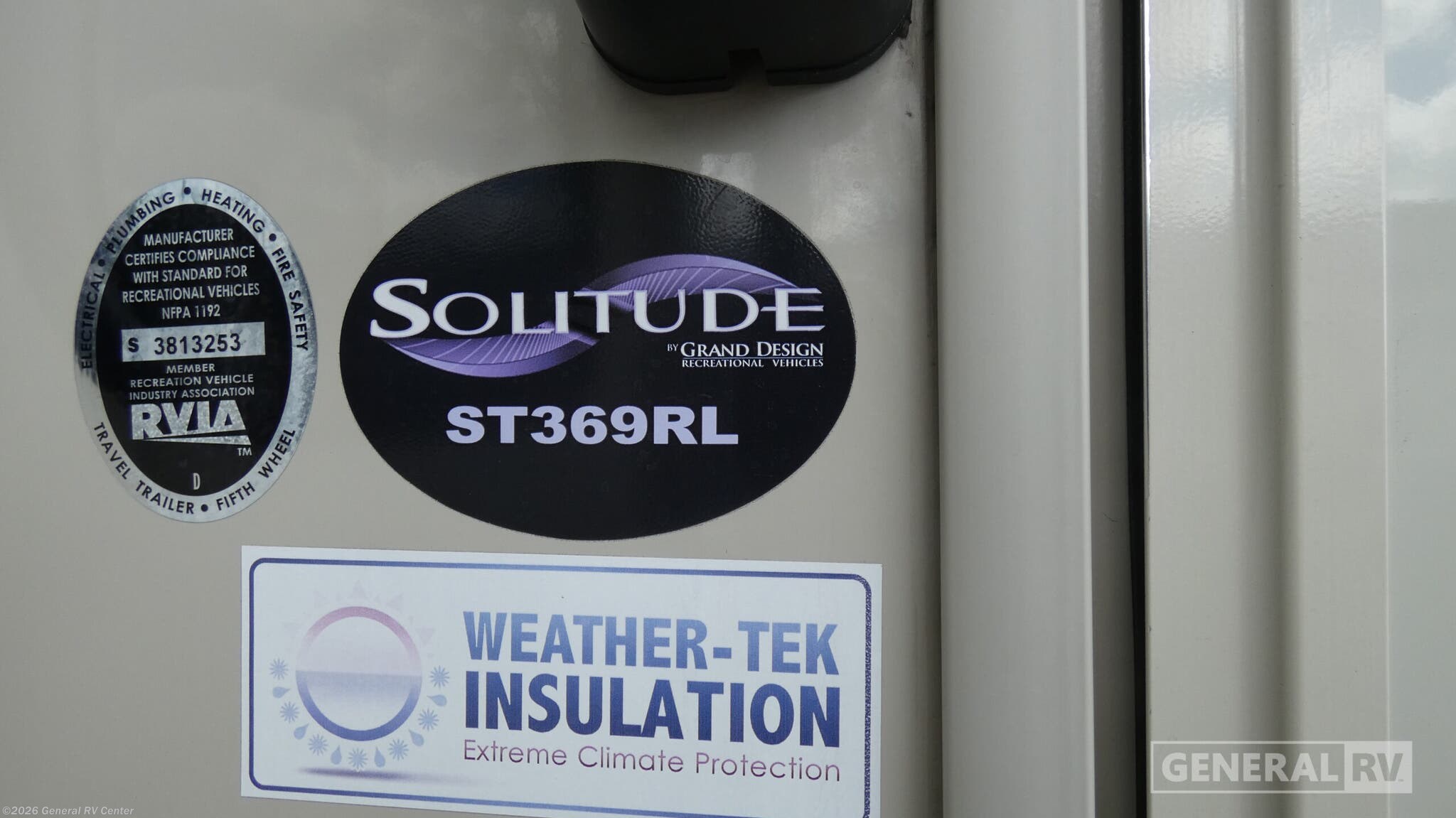 Enter this Solitude fifth wheel 369RL by Grand Design and be amazed at the wide open space you see with dual opposing slides in the combined kitchen and living area. Straight in the door there is a counter area with overhead cabinets and lower cabinet storage. A slide-out dinette table and chairs plus theater seating for two is to the left of the entry door. Enjoy a sofa along the rear wall featuring overhead cabinets and end tables. The entertainment center is located in the opposite slide featuring an LED TV with fireplace below and slide-out desk with drawers also. Along with the entertainment center there is also a large pantry for storing dry goods, a three burner range, counter space, and refrigerator. You may choose to add a larger side-by-side refrigerator if you like. The convenient kitchen island provides a bit more counter space and dual sinks making cleanup and food prep a breeze. Head right once inside the front entry door and notice the convenient coat closet on the left as you head up the steps to the top where you will find a full bath including: a toilet, vanity with vessel sink, linen cabinet, and 48" x 30" shower with seat. Continue down the hall to the front master bedroom to a king size bed slide, pull-out ottoman at the foot of the bed, dresser opposite, the bed, and a walk-in closet with shirt storage on one side and a space prepped for a washer and dryer if you choose. In this unit you can add an optional HDTV in the master bedroom, a stainless steel refrigerator, and a washer and dryer, plus so much more!