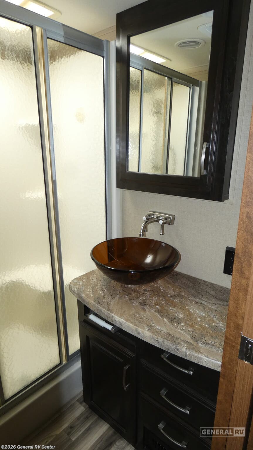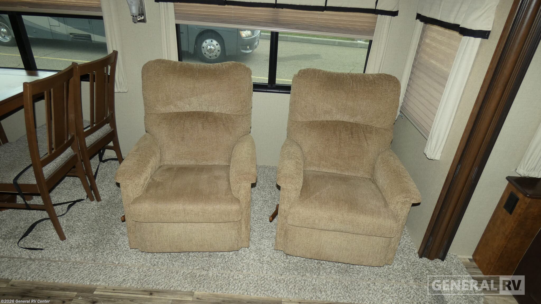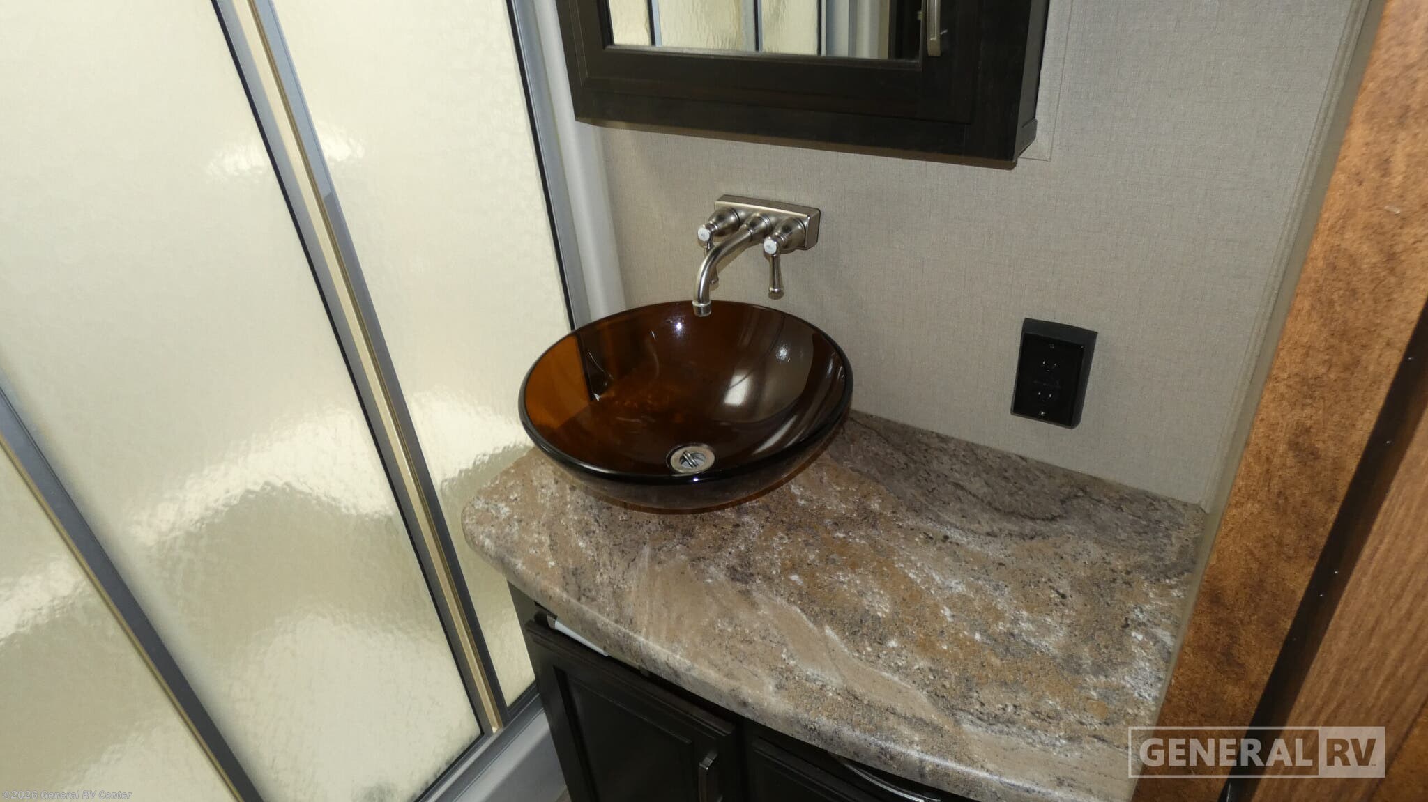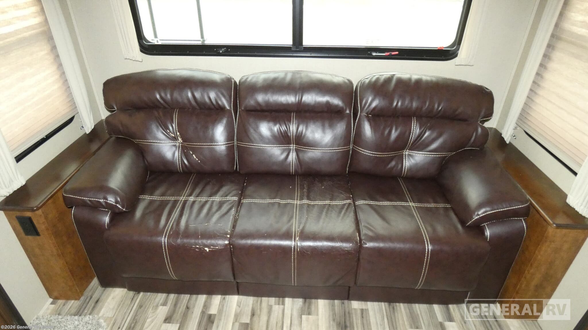 Enter this Solitude fifth wheel 369RL by Grand Design and be amazed at the wide open space you see with dual opposing slides in the combined kitchen and living area. Straight in the door there is a counter area with overhead cabinets and lower cabinet storage. A slide-out dinette table and chairs plus theater seating for two is to the left of the entry door. Enjoy a sofa along the rear wall featuring overhead cabinets and end tables. The entertainment center is located in the opposite slide featuring an LED TV with fireplace below and slide-out desk with drawers also. Along with the entertainment center there is also a large pantry for storing dry goods, a three burner range, counter space, and refrigerator. You may choose to add a larger side-by-side refrigerator if you like. The convenient kitchen island provides a bit more counter space and dual sinks making cleanup and food prep a breeze. Head right once inside the front entry door and notice the convenient coat closet on the left as you head up the steps to the top where you will find a full bath including: a toilet, vanity with vessel sink, linen cabinet, and 48" x 30" shower with seat. Continue down the hall to the front master bedroom to a king size bed slide, pull-out ottoman at the foot of the bed, dresser opposite, the bed, and a walk-in closet with shirt storage on one side and a space prepped for a washer and dryer if you choose. In this unit you can add an optional HDTV in the master bedroom, a stainless steel refrigerator, and a washer and dryer, plus so much more!