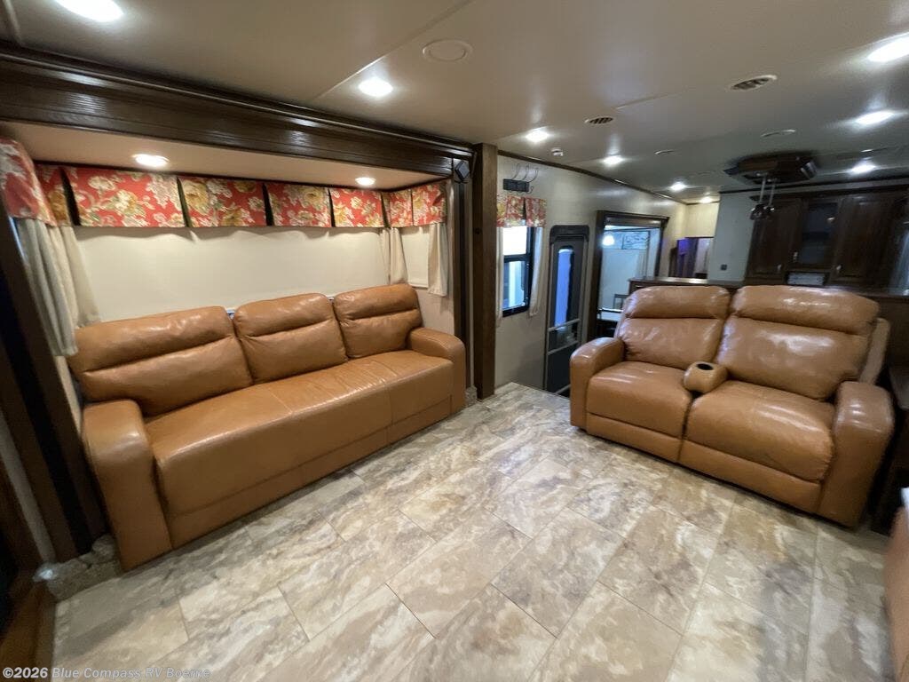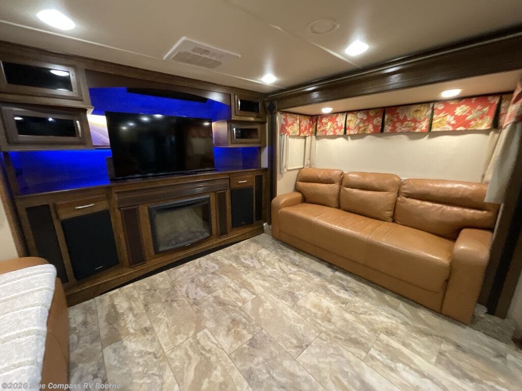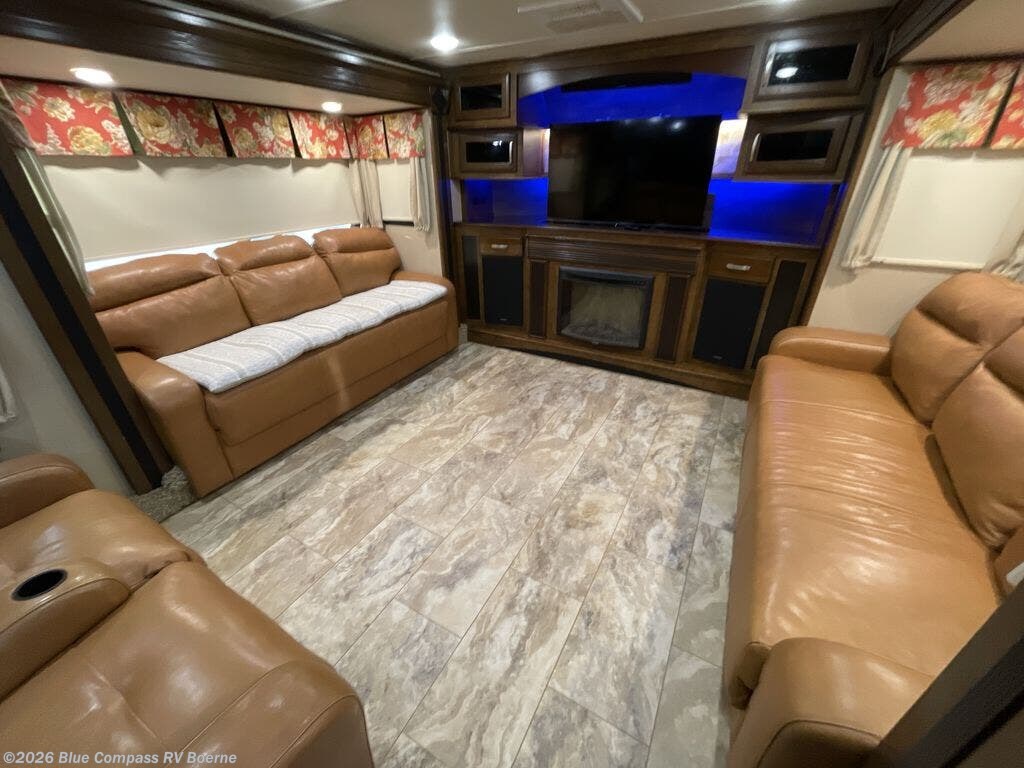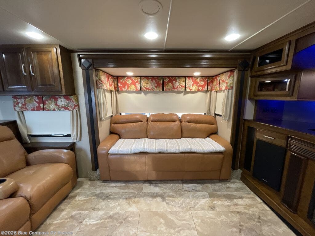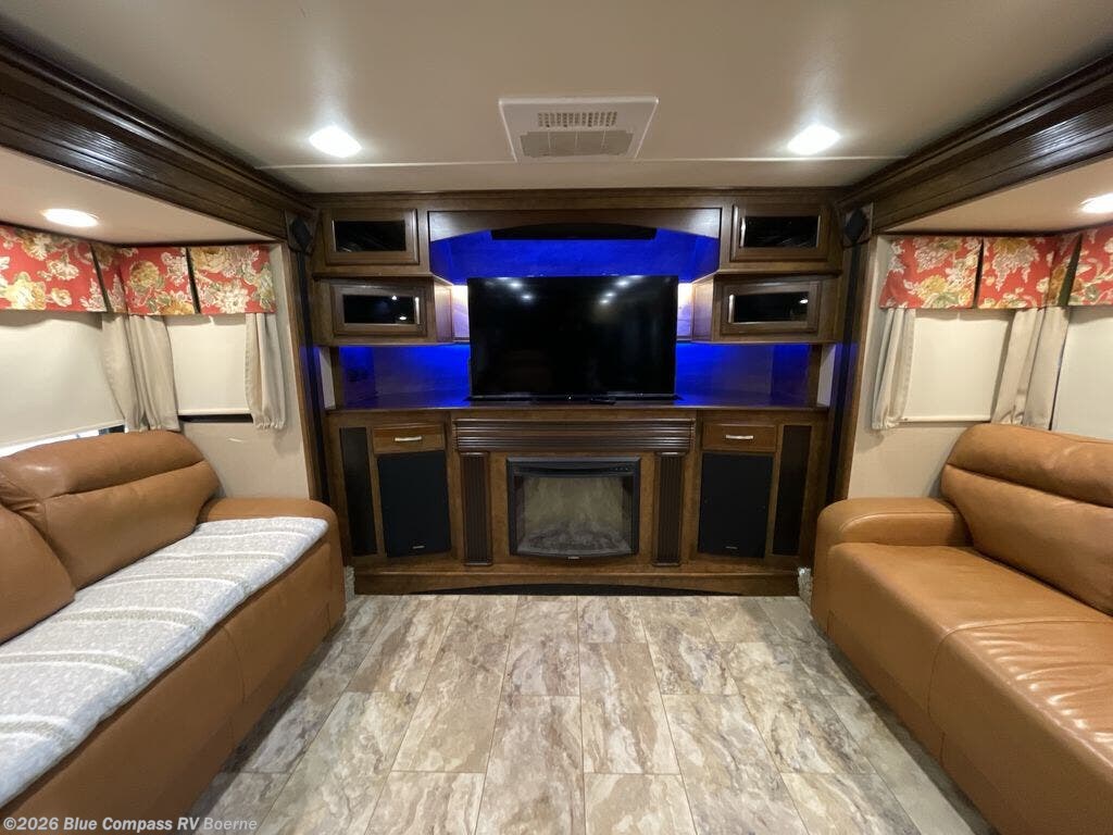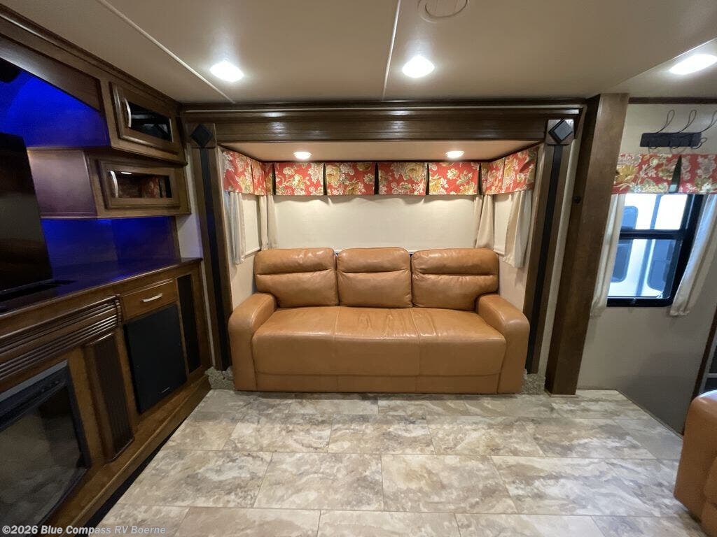 The front living area also features dual slides with two 80" tri-fold sofas. There is a 58" theater sofa to the left as you enter the living space and a 50" LED HDTV at the front of the room with optional fireplace below. The perfect space for entertaining guests and enjoying a conversation with family and friends.