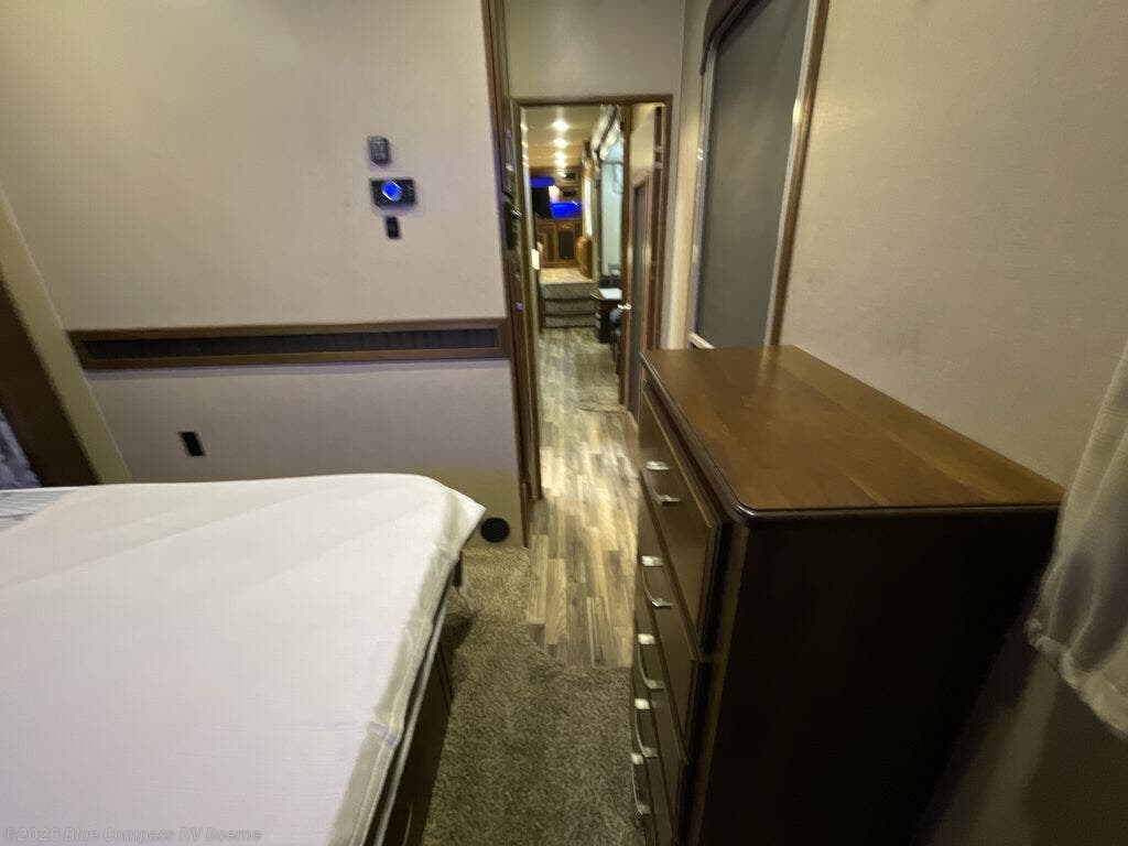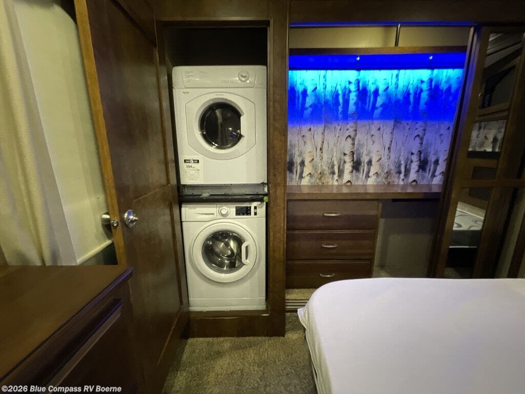 The rear private bedroom with its own entry door features a standard queen size bed slide-out, or you may choose an optional king. There is a pull-out ottoman at the foot of the bed, and an LED HDTV on the opposite wall. Along the rear wall of the bedroom you will find a double closet with drawers on one side, and a space prepped for a washer and dryer if you choose to add also.