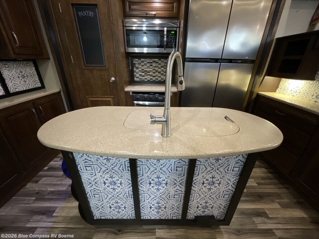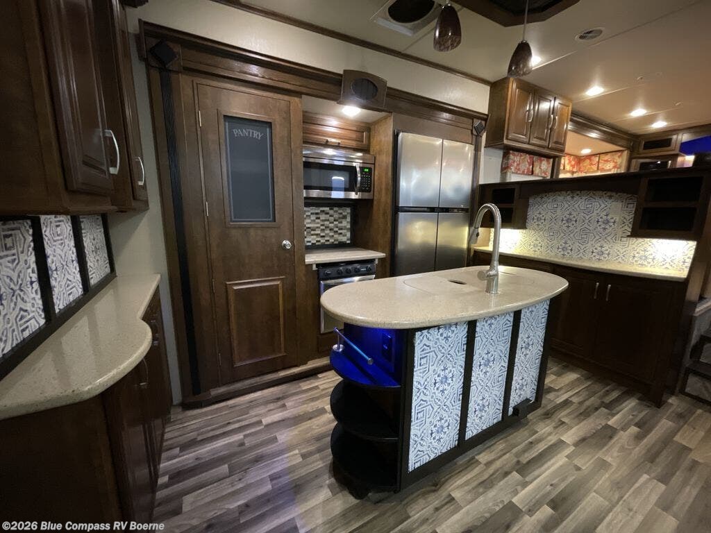 Step inside the entry door closest to the front. As you enter you are in a spacious kitchen featuring dual opposing slides. To your left is a slide-out dinette table and chairs. There is a center island with double sinks including counter space. You will find even more counter space on either side of the room along the interior walls with overhead cabinets and base cabinet storage also. The slide opposite the dinette features a large pantry, three burner range, refrigerator, and second smaller pantry.