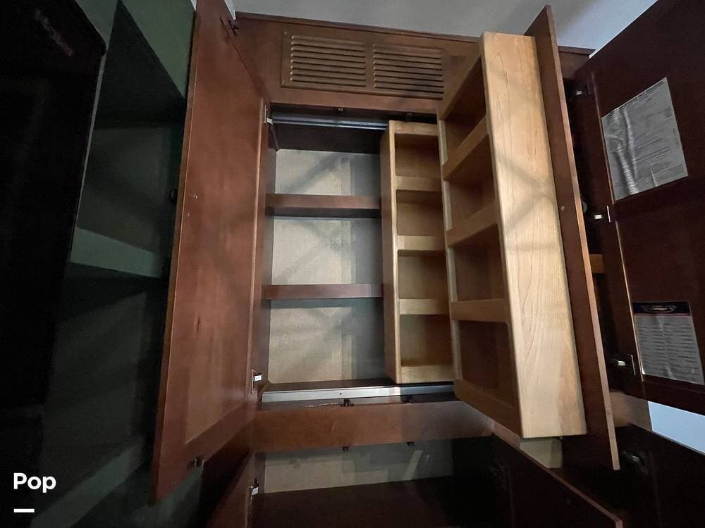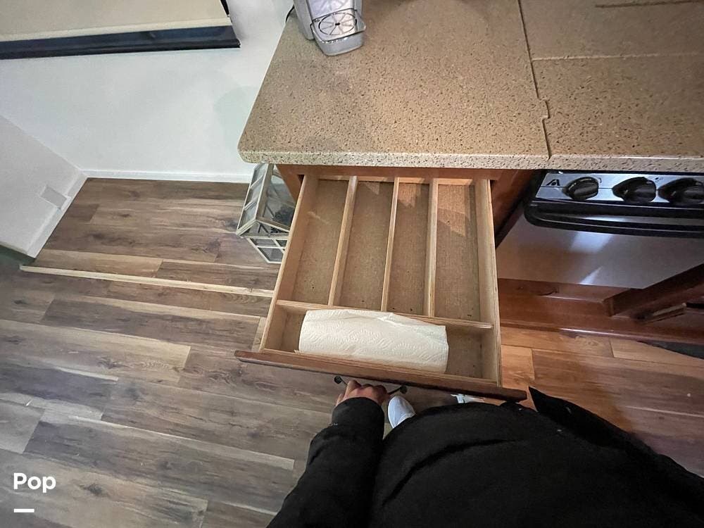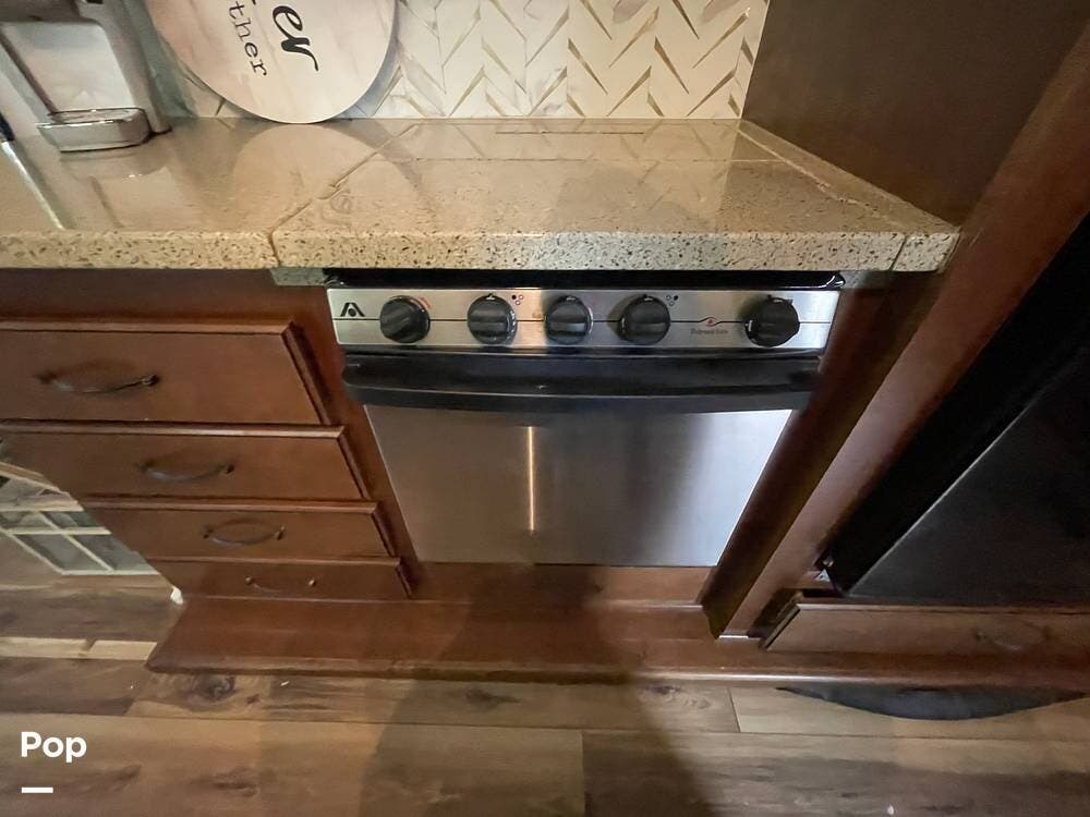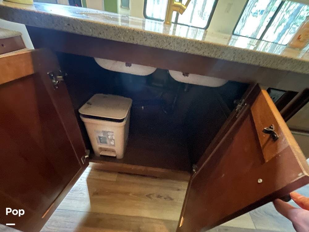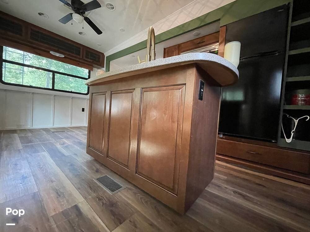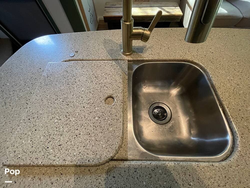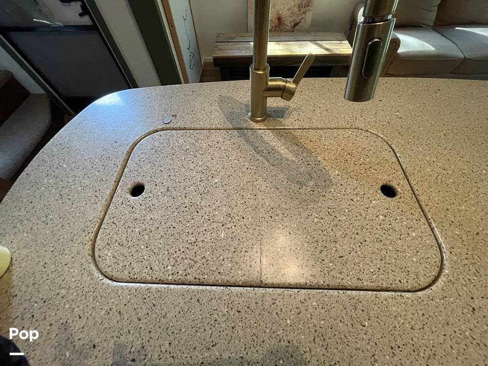 Inside, you see the quality, real wood cabinets, solid-surface countertops throughout, and the fit and finish of the RV is first-class. There are plenty of cabinets and storage, making meal prep easy. And there is a custom table as well.