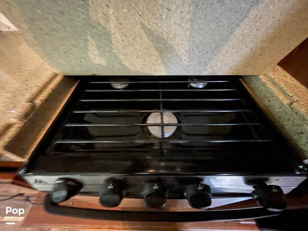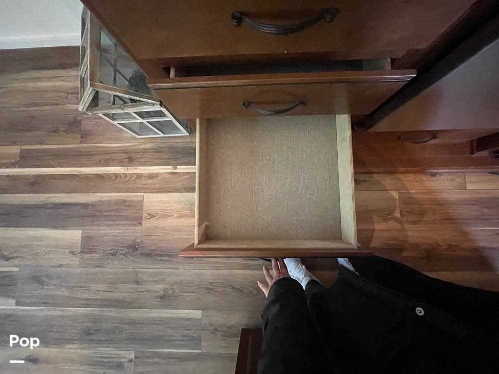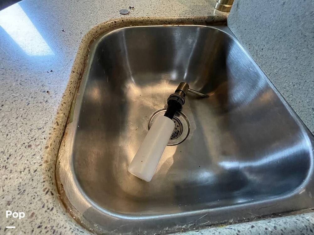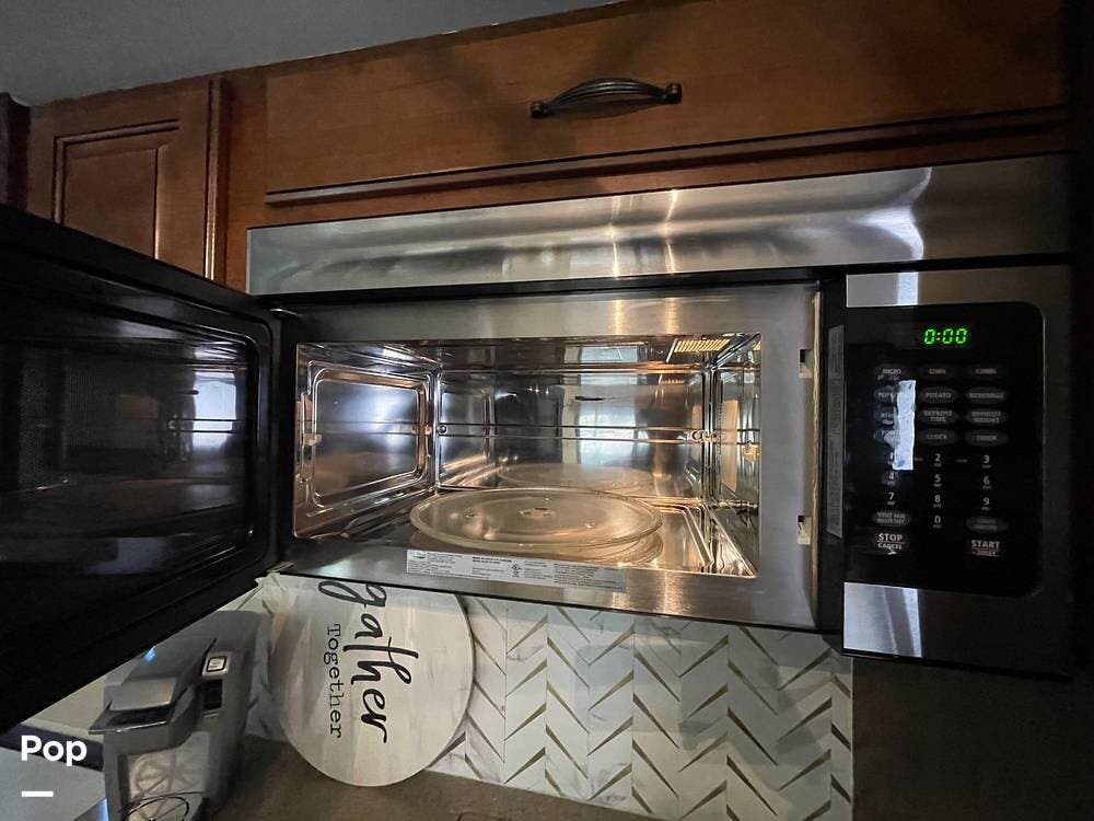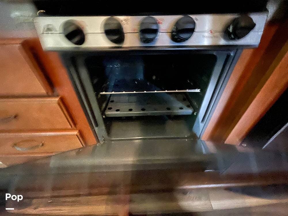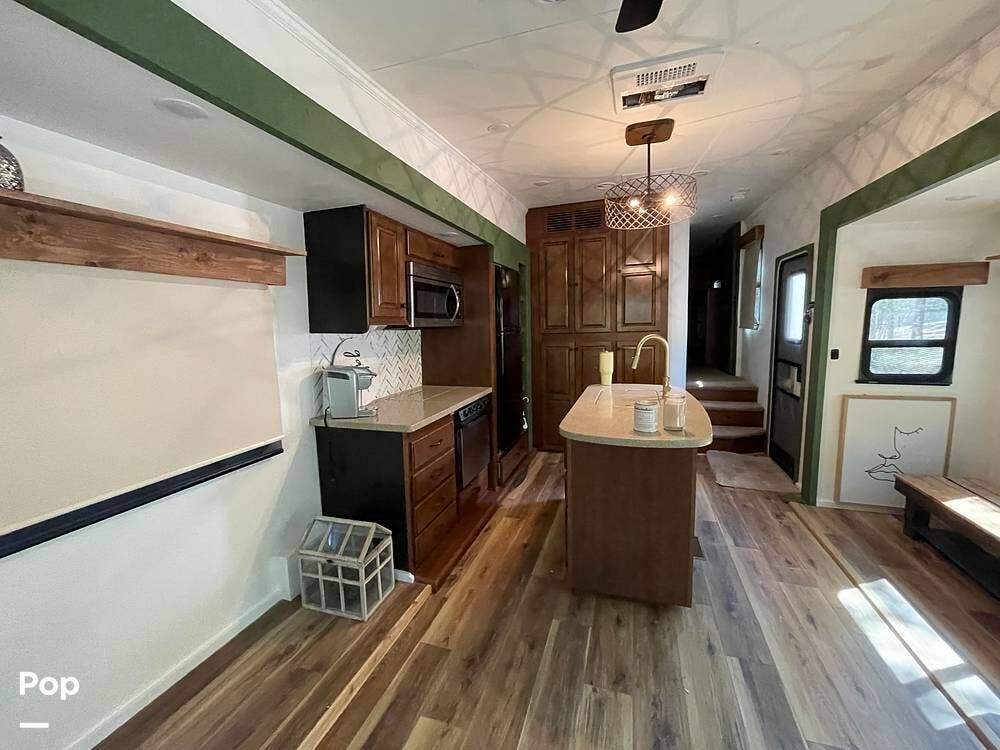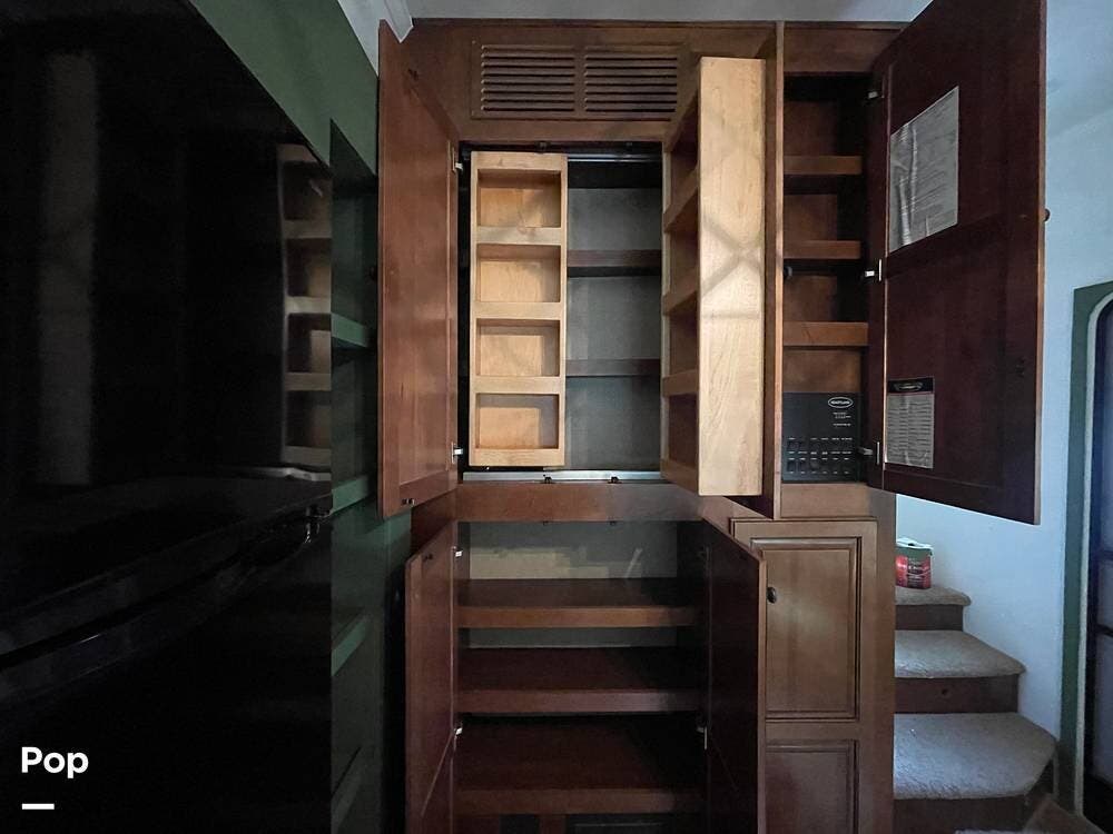 Inside, you see the quality, real wood cabinets, solid-surface countertops throughout, and the fit and finish of the RV is first-class. There are plenty of cabinets and storage, making meal prep easy. And there is a custom table as well.