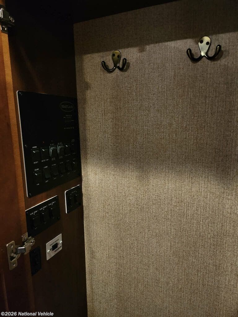 Toward the rear, the private master suite offers a comfortable king bed, large wardrobe, dresser, and washer/dryer prep-making it ideal for extended travel. The spacious bathroom includes a large shower, vanity with ample counter space, linen storage, and a porcelain toilet, delivering the comforts of home.