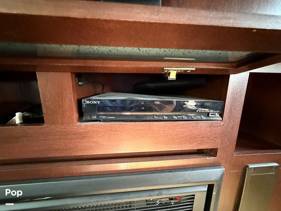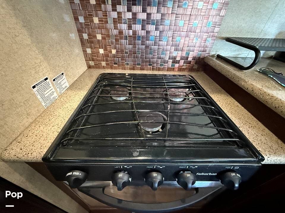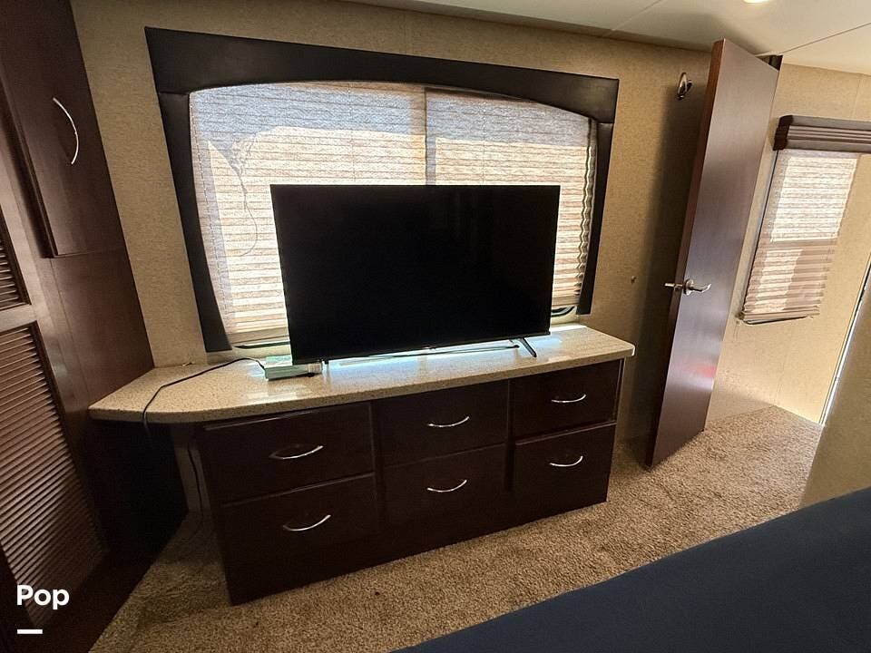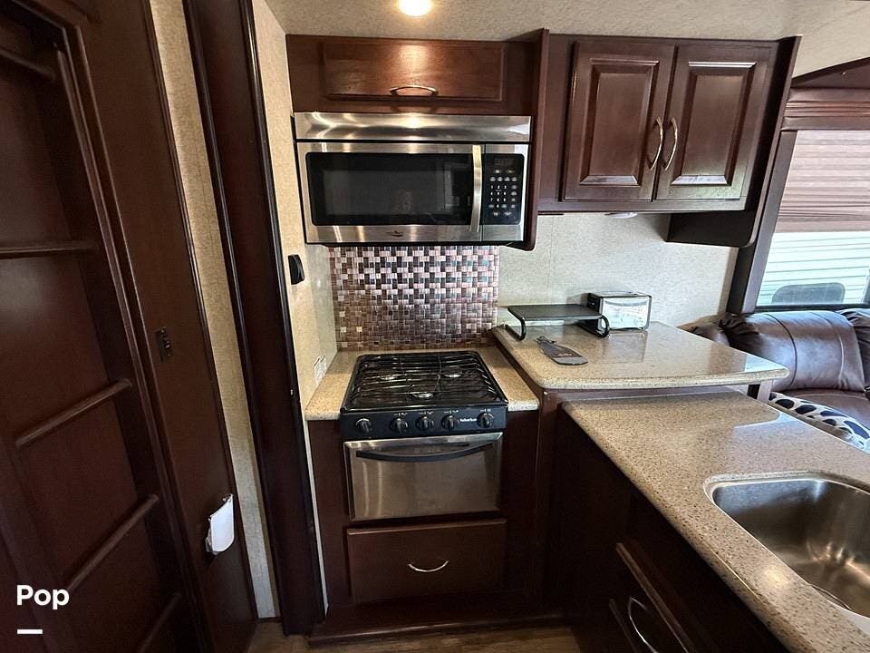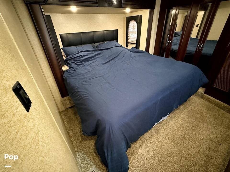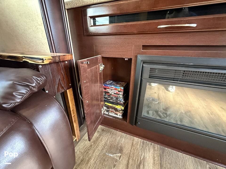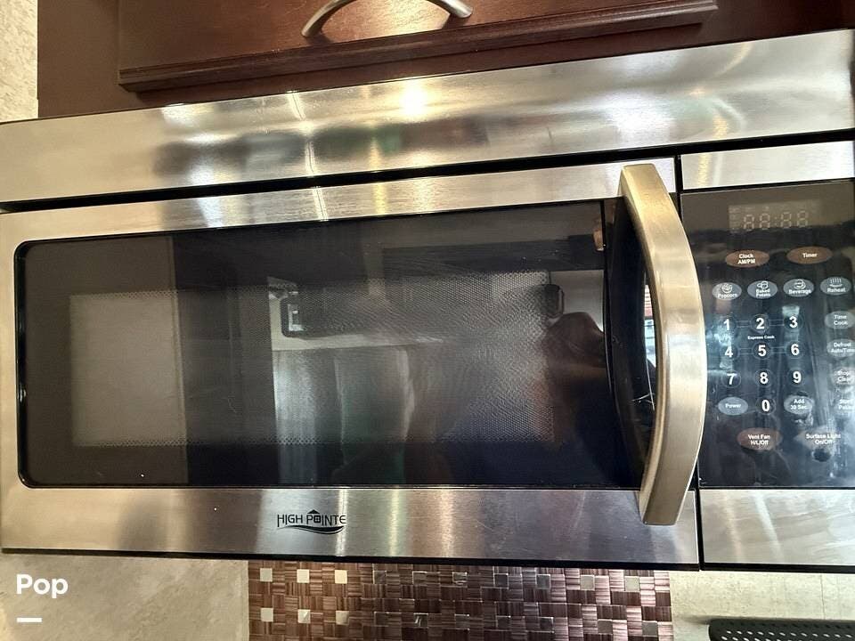 Inside, you'll find residential-style comfort with a fully equipped kitchen, including solid surface countertops, a three-burner stove, oven, microwave, and refrigerator. Relax in the roomy living area with reclining seating, an entertainment center, and a fireplace, while the master suite offers a king-size bed for restful nights.
