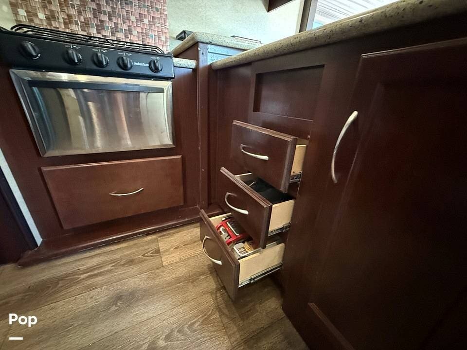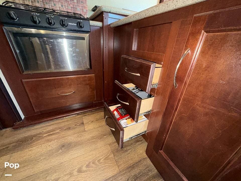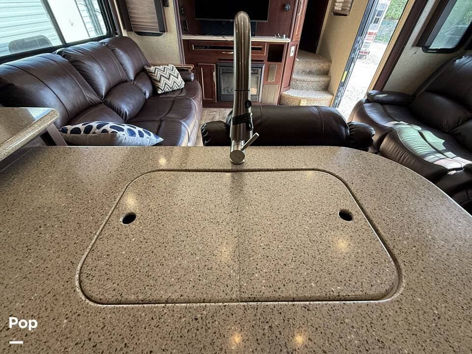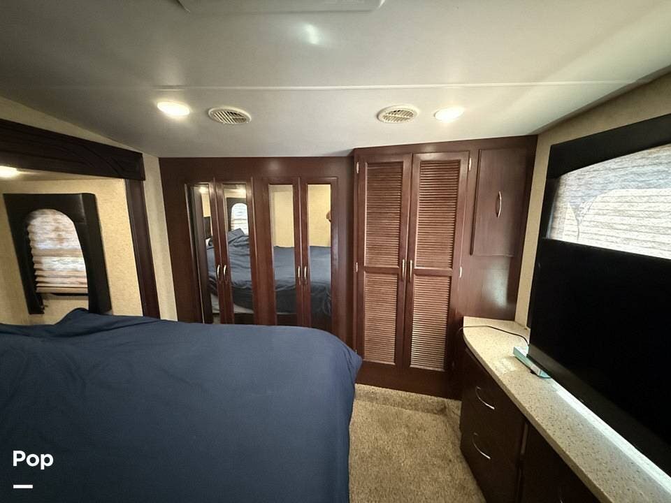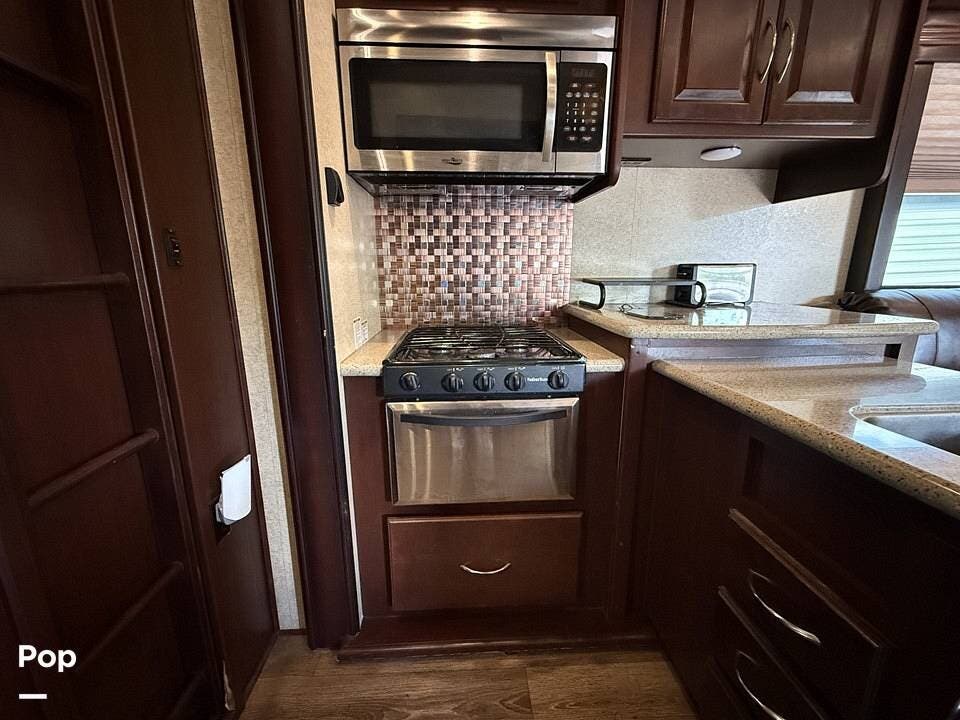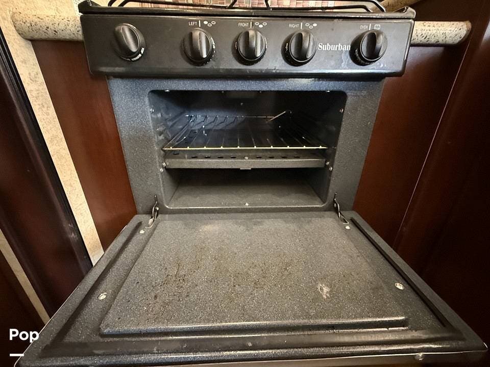 Inside, you'll find residential-style comfort with a fully equipped kitchen, including solid surface countertops, a three-burner stove, oven, microwave, and refrigerator. Relax in the roomy living area with reclining seating, an entertainment center, and a fireplace, while the master suite offers a king-size bed for restful nights.