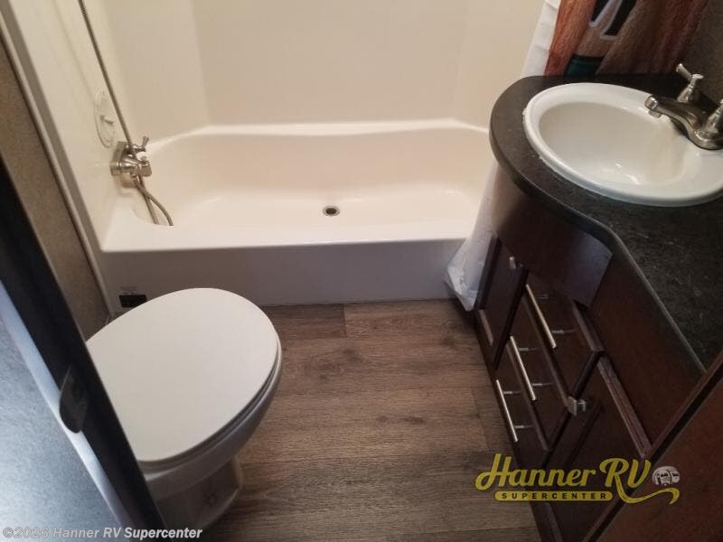 Just inside the main entry door you can step up to a side aisle bath and front bedroom. The bath features a toilet, sink and sunken tub/shower. The private bedroom in front feature a slide out bed, a front wardrobe with sliding doors, and a dresser for even more storage. There is also a closet with washer dryer prep, plus so much more.