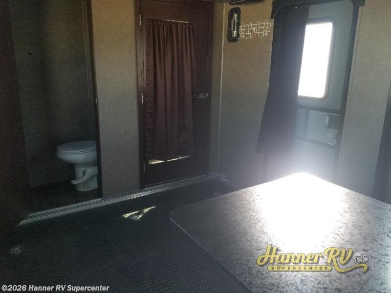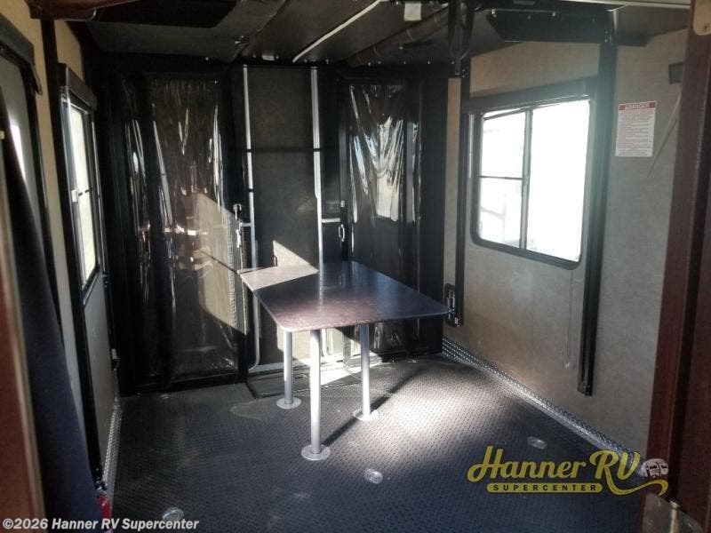 Get started with 12' of garage space including a rear ramp door for ease of loading and unloading. There is also a side man door into the cargo area if you need to check on things while on the move or after the rear ramp door is closed. There is also an additional loft space in the front of the cargo area and a convenience half bath too. A ladder to the loft can be found just inside the main living area door.