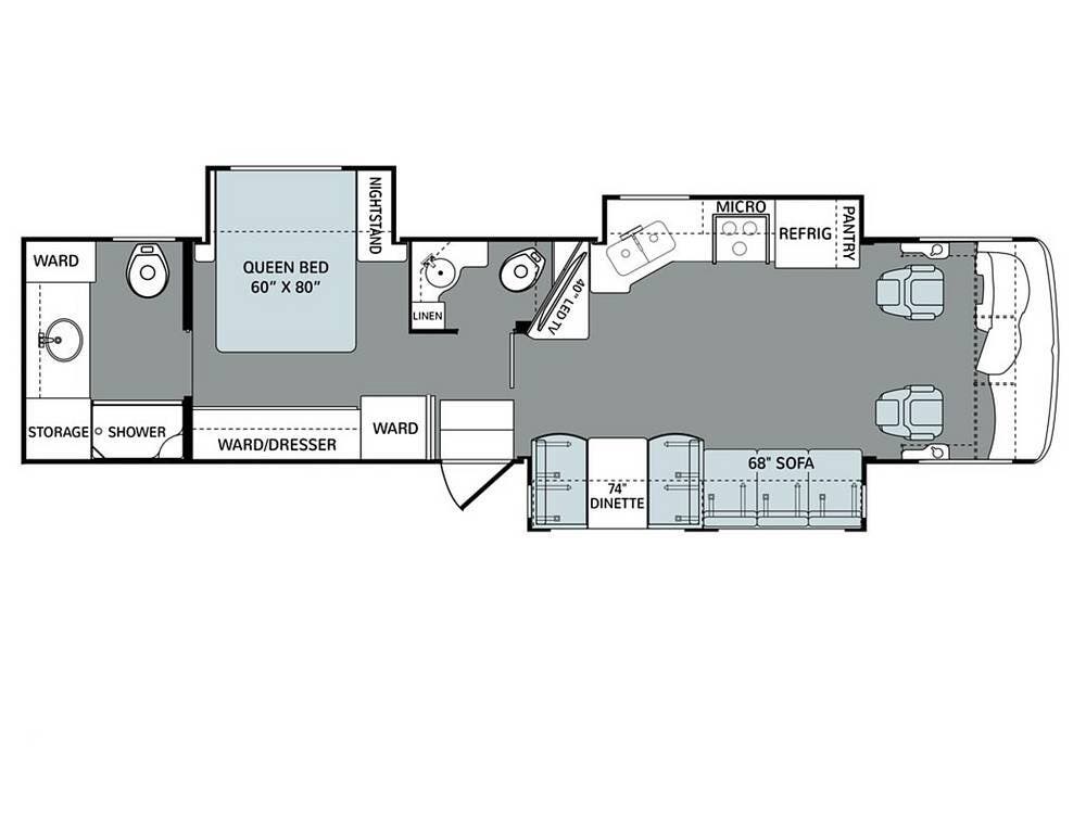 The rear master bedroom offers a queen bed, wardrobe storage, dresser space, washer and dryer, and access to the full rear bath. The coach has two A/C units and heating options with electric or propane heat.