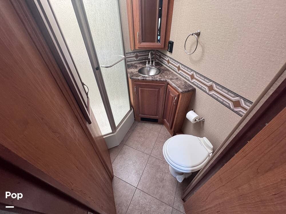 The bathroom is thoughtfully arranged for daily comfort, offering a functional layout that supports life on the road.